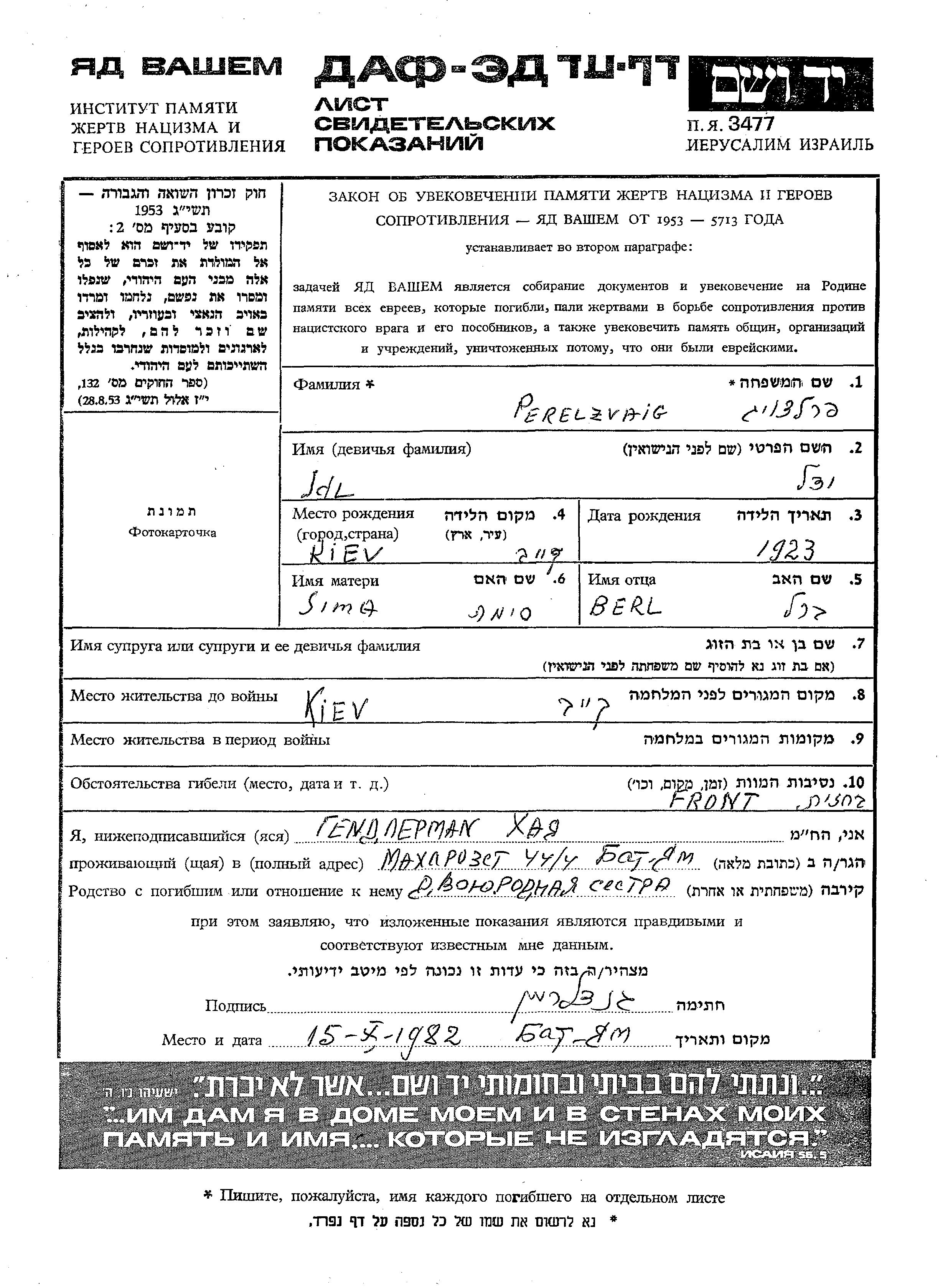 Perelzvaig Idl Jidel 1923 Kiev, Ukraine (URSS) Feuille de témoignage