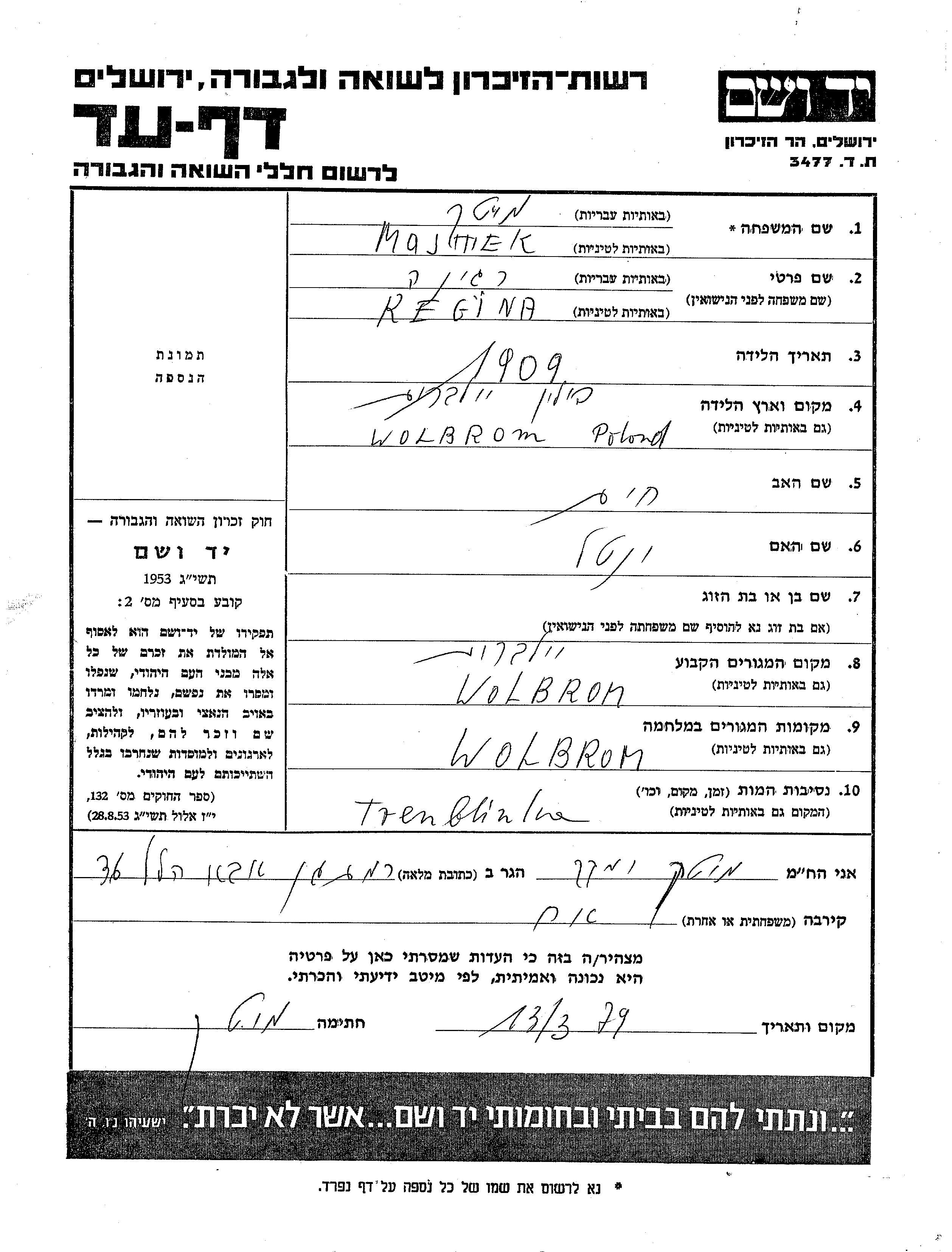 Majttek Regina 1909 Wolbrom, Pologne Feuille de témoignage