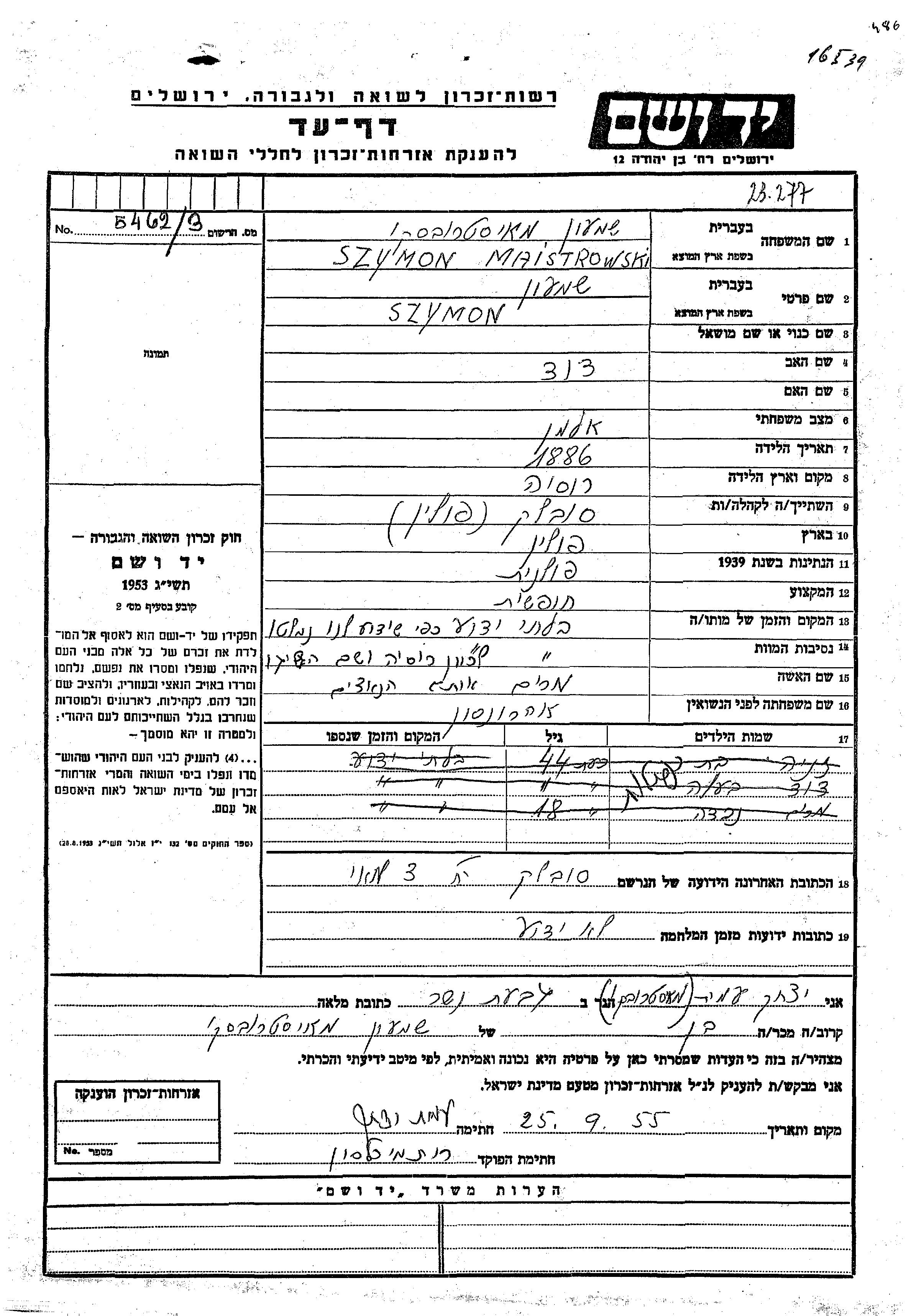 Szymon Maistrowski est né à Russie (URSS) en 1886, fils de David. Il était Profession libérale et veuf de Miriam née Aharonson. Avant la seconde guerre mondiale il vivait à Sovalek, Pologne. Au cours de la guerre, il était à Sovalek, Pologne.