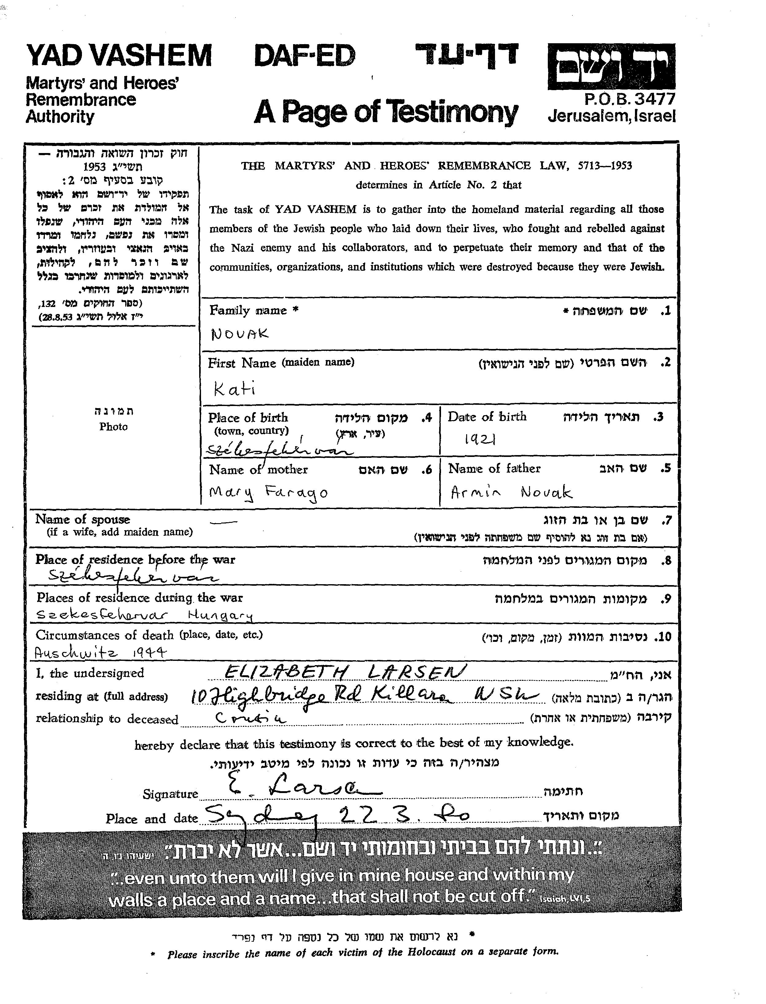 Novak Kati 1921 Szekesfehervar, Hongrie Feuille de témoignage