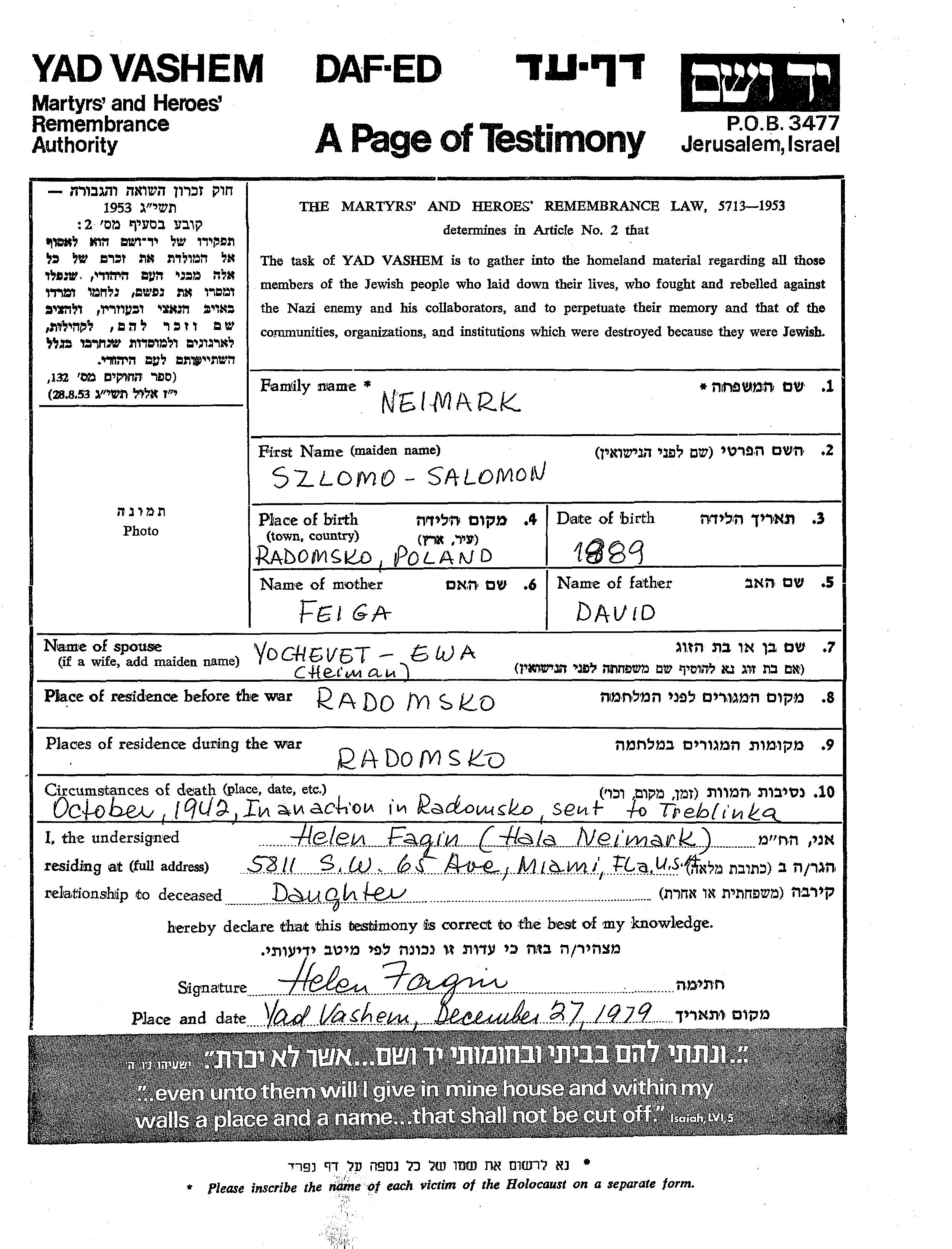 Szlomo Neimark est né à Radomsko, Pologne en 1889, fils de David et de Feiga. Il était Mariée à Yochevet Ewa née Cherman. Avant la seconde guerre mondiale il vivait à Radomsko, Pologne. Au cours de la guerre, il était à Radomsko, Pologne.