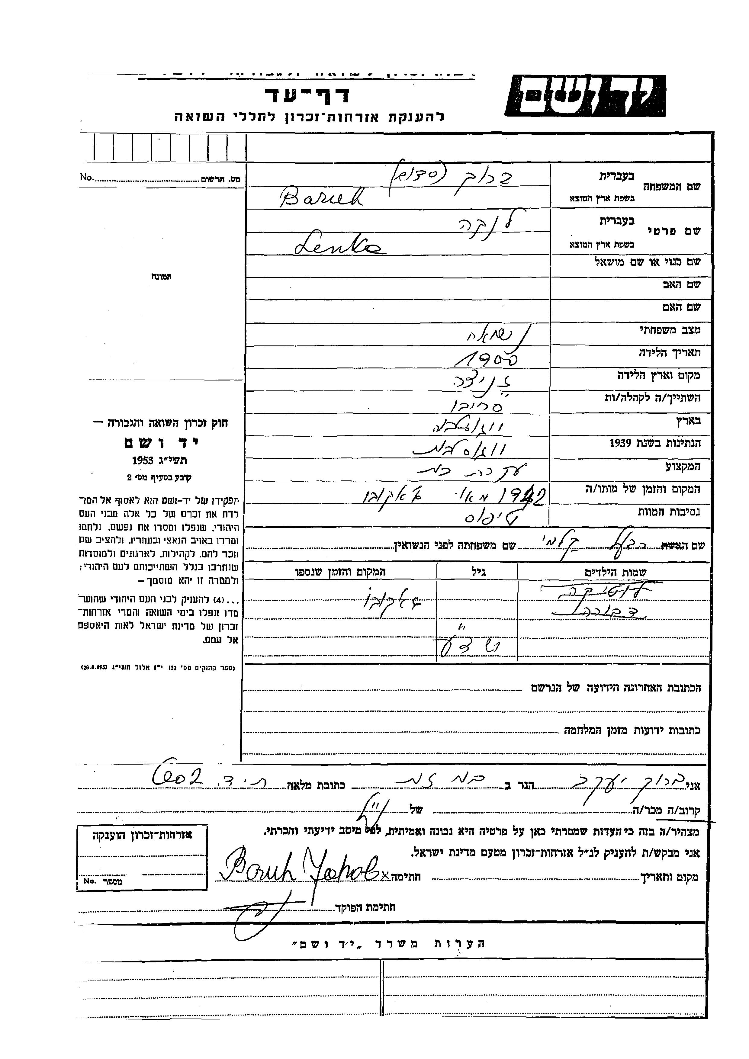 Yad Vashem - Pages of Testimony Names Memorial Collection