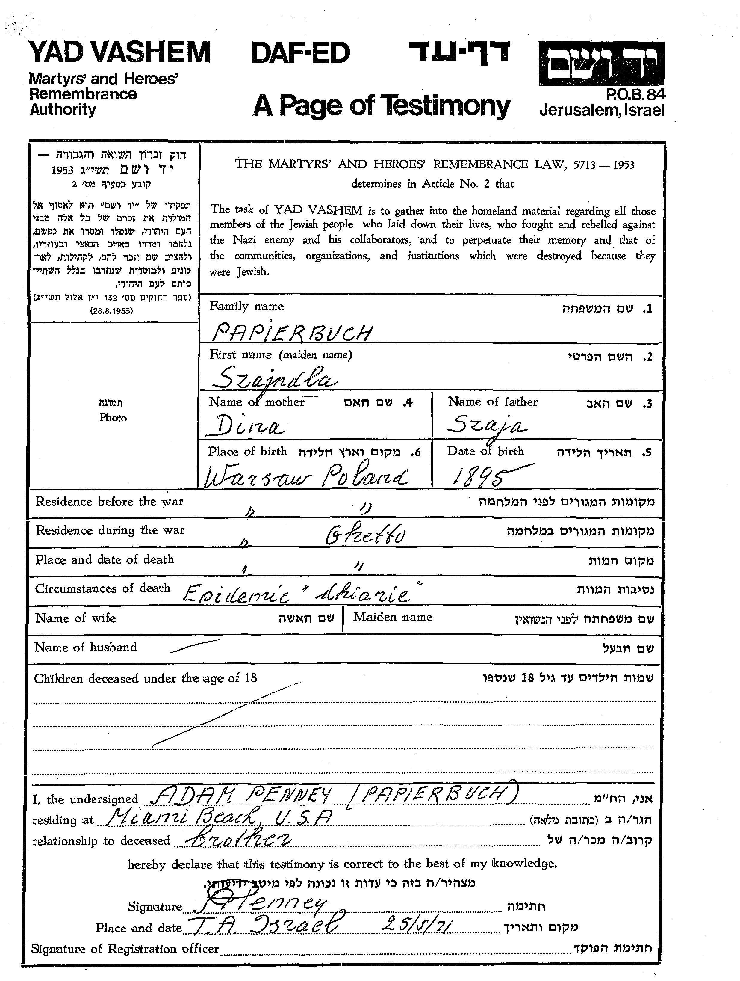 Szajndla Papierbuch est née à Warsaw, Pologne en 1895, fille de Szaja et de Dina. Avant la seconde guerre mondiale elle vivait à Warsaw, Pologne. Pendant la guerre, elle était à Warsaw, Pologne.