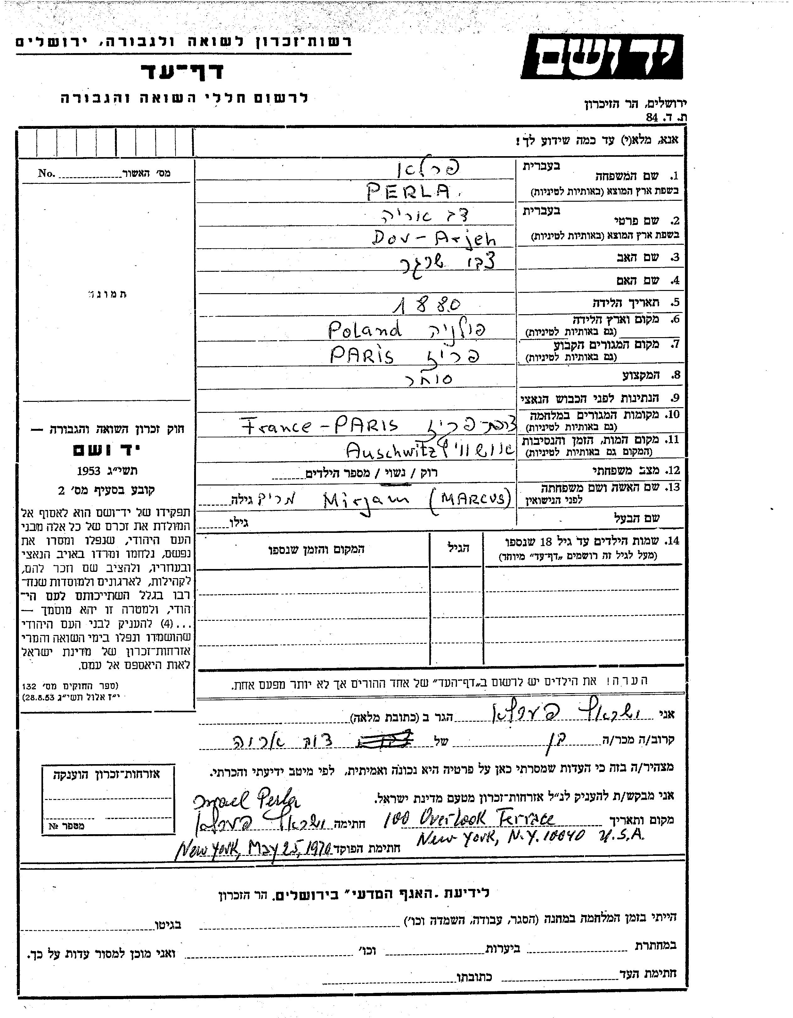 Arjeh Dov Perla est né à Pologne en 1880, fils de Tzvi Shraga. Il était Commerçant/e et Mariée à Mirjam née Marcus. Avant la seconde guerre mondiale il vivait à Paris, France. Au cours de la guerre, il était à Paris, France.