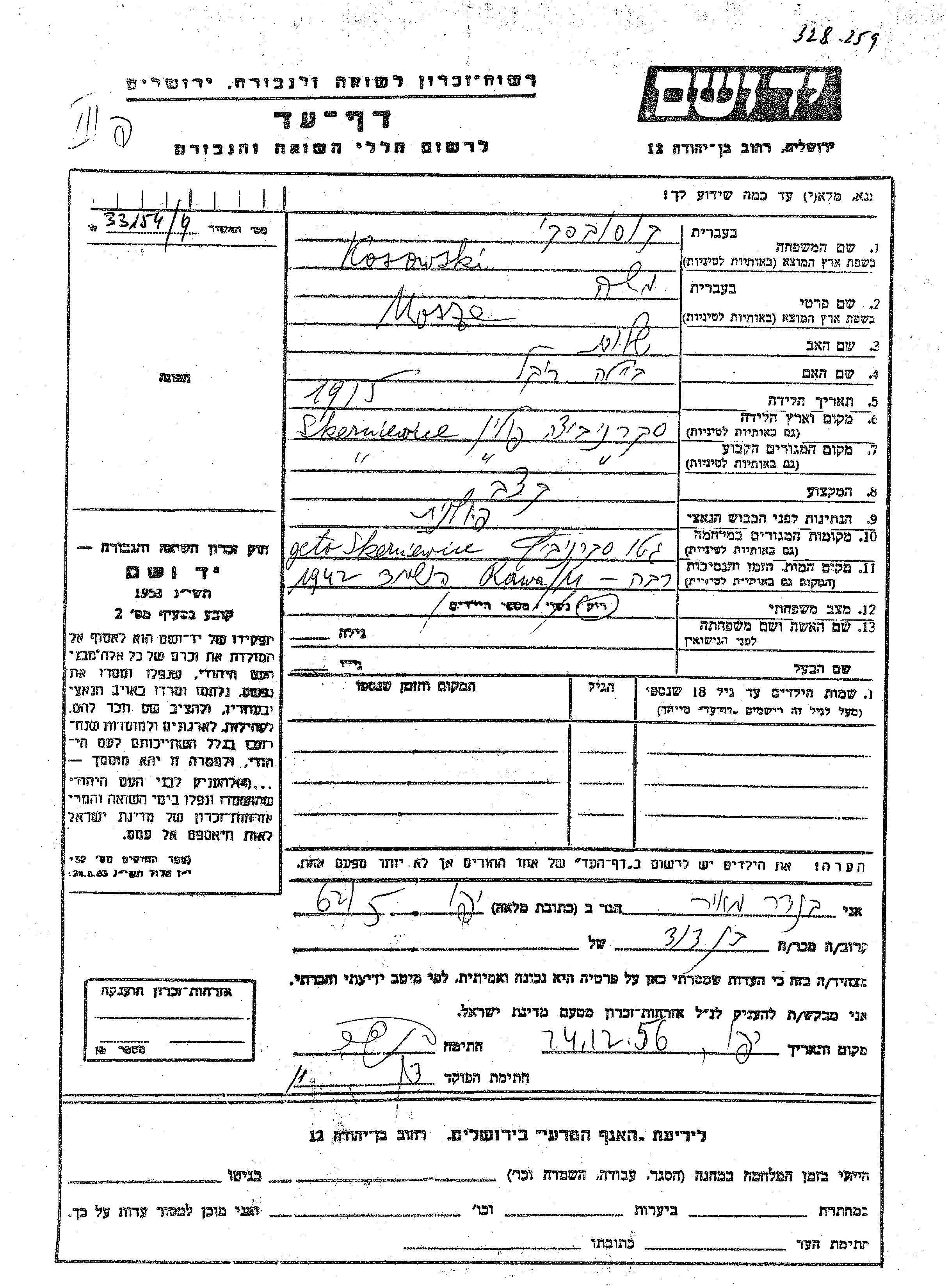 Mosze Kosowski est né à Skerniewice, Pologne en 1915, fils de Shalom et de Beila Rikel. Il était Boucher et Célibataire. Avant la seconde guerre mondiale il vivait à Skerniewice, Pologne. Au cours de la guerre, il était à Skierniewice, Pologne.