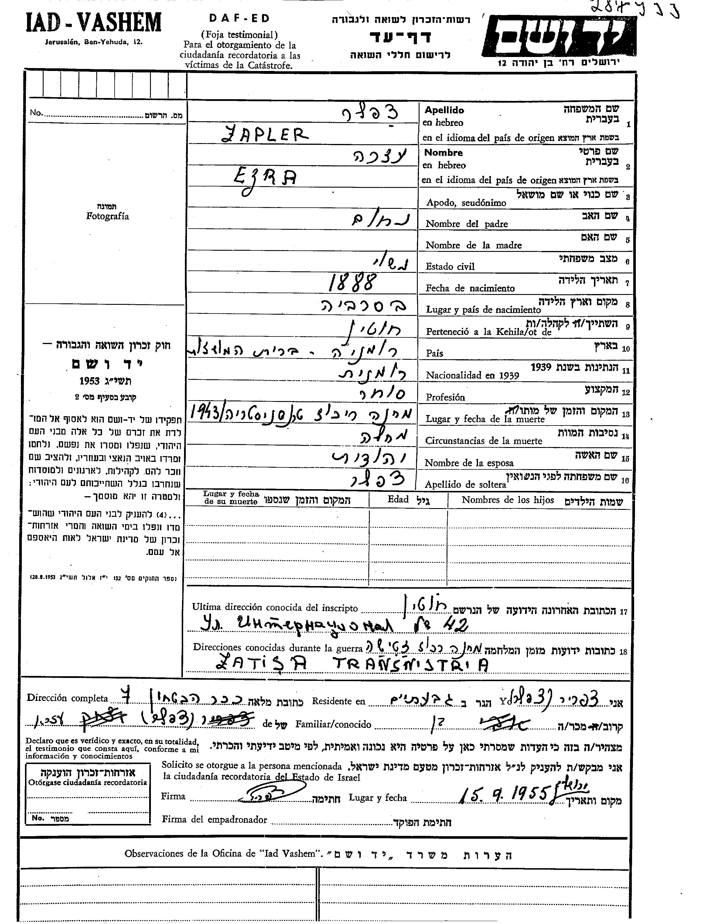 Ezra Zapler est né à Bessarabia, Roumanie en 1888, fils de Nakhum. Il était Commerçant/e et Mariée à Yehudit. Avant la seconde guerre mondiale il vivait à Hotin, Roumanie. Au cours de la guerre, il était à Transnistria, Ukraine (URSS).