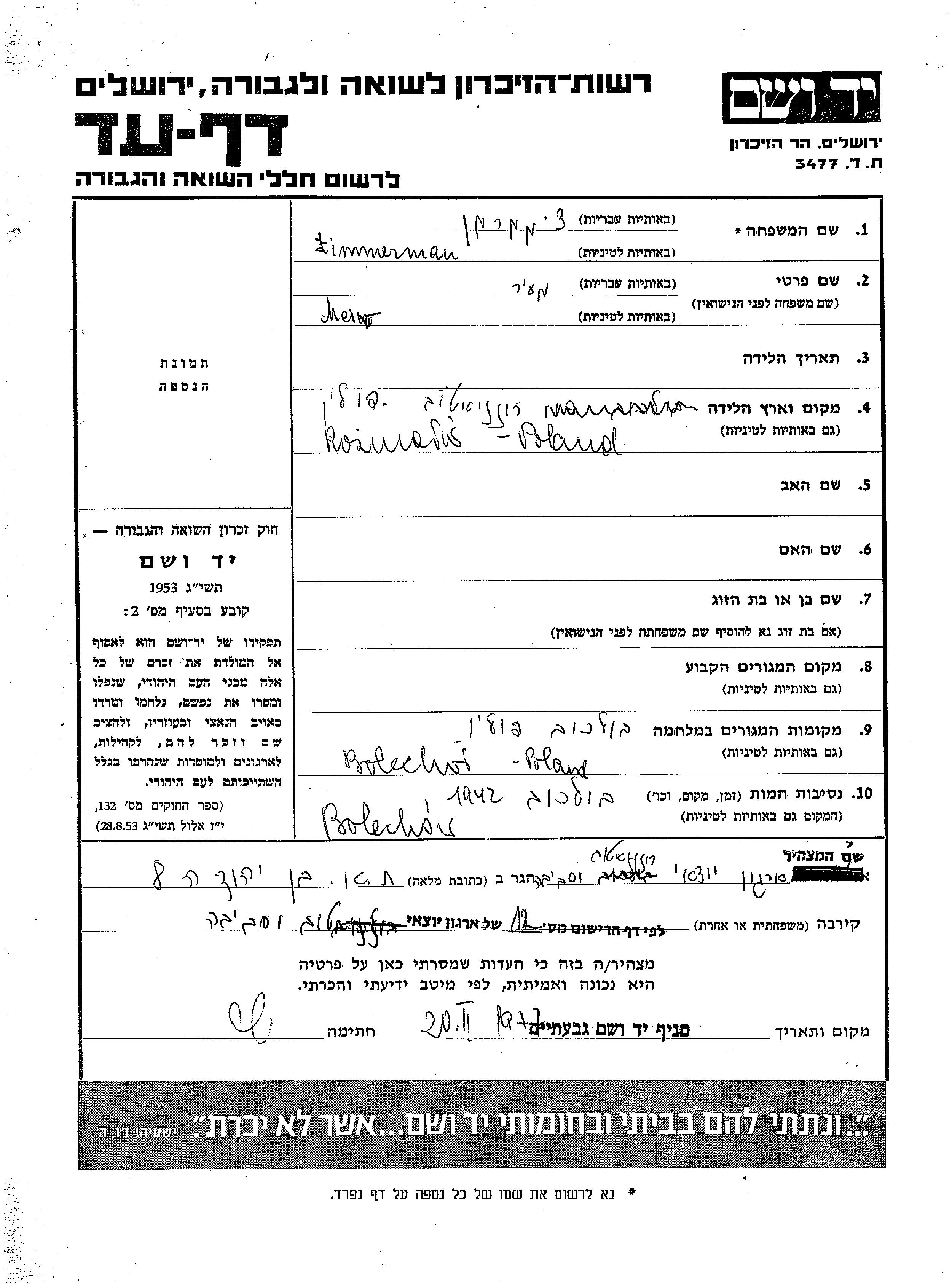 Zimmerman Meir endroit inconnu, Feuille de témoignage