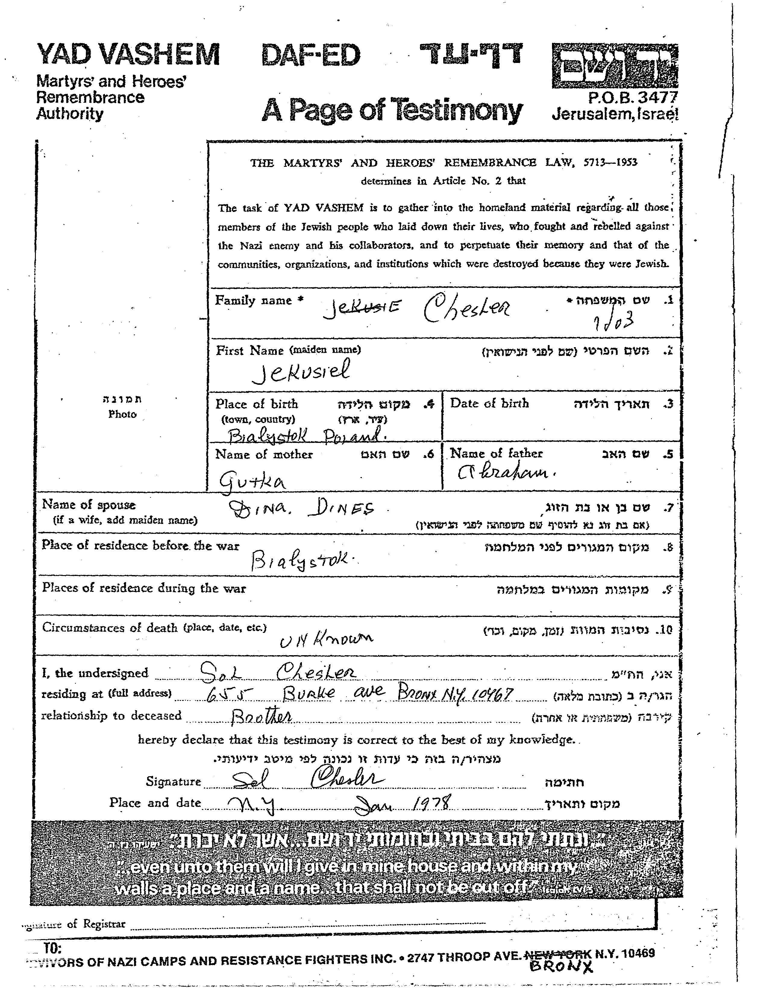 Chesler Jekusiel Bialystok, Pologne Feuille de témoignage