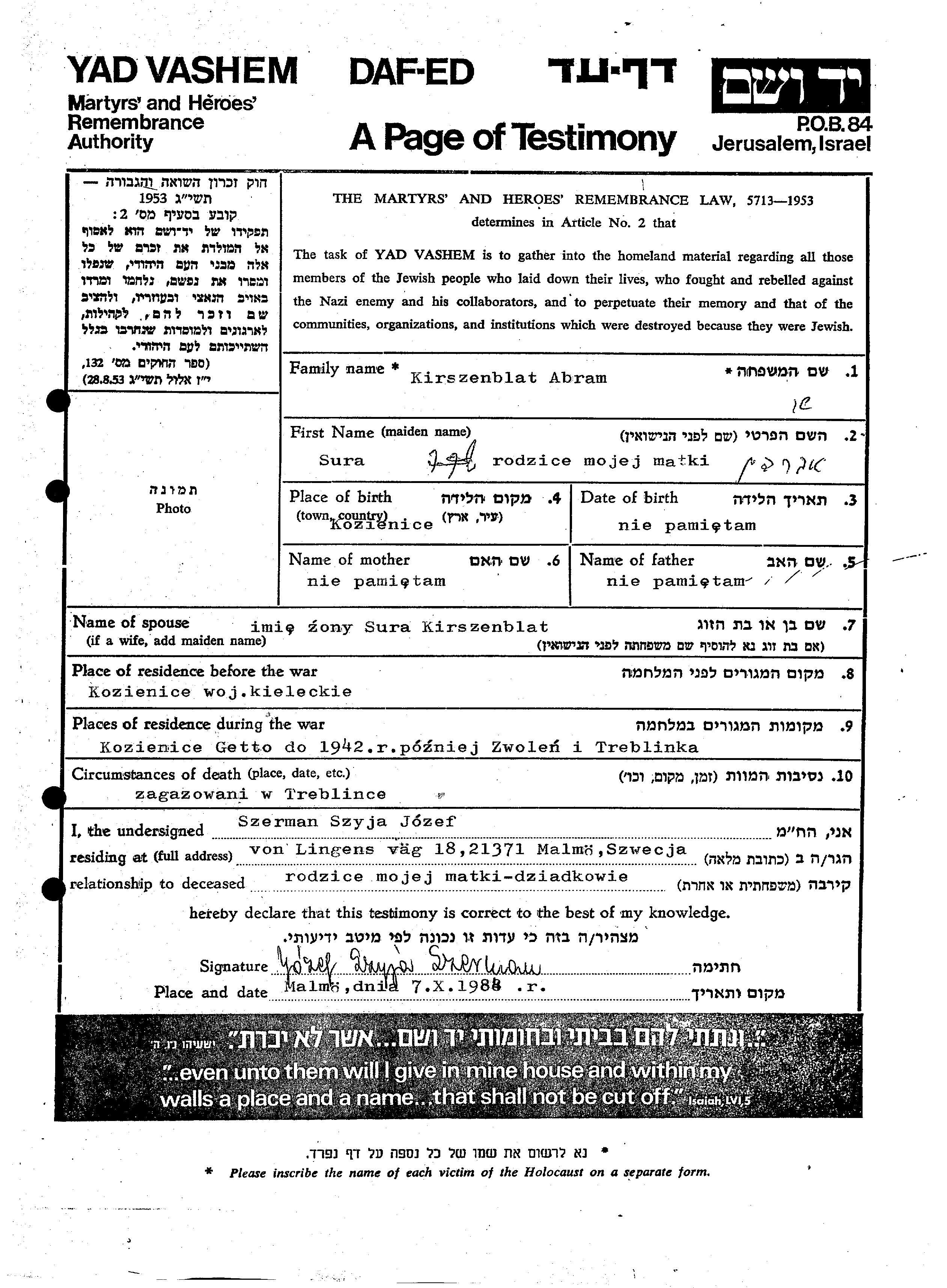 Kirszenblat Abram Kozienice, Pologne Feuille de témoignage