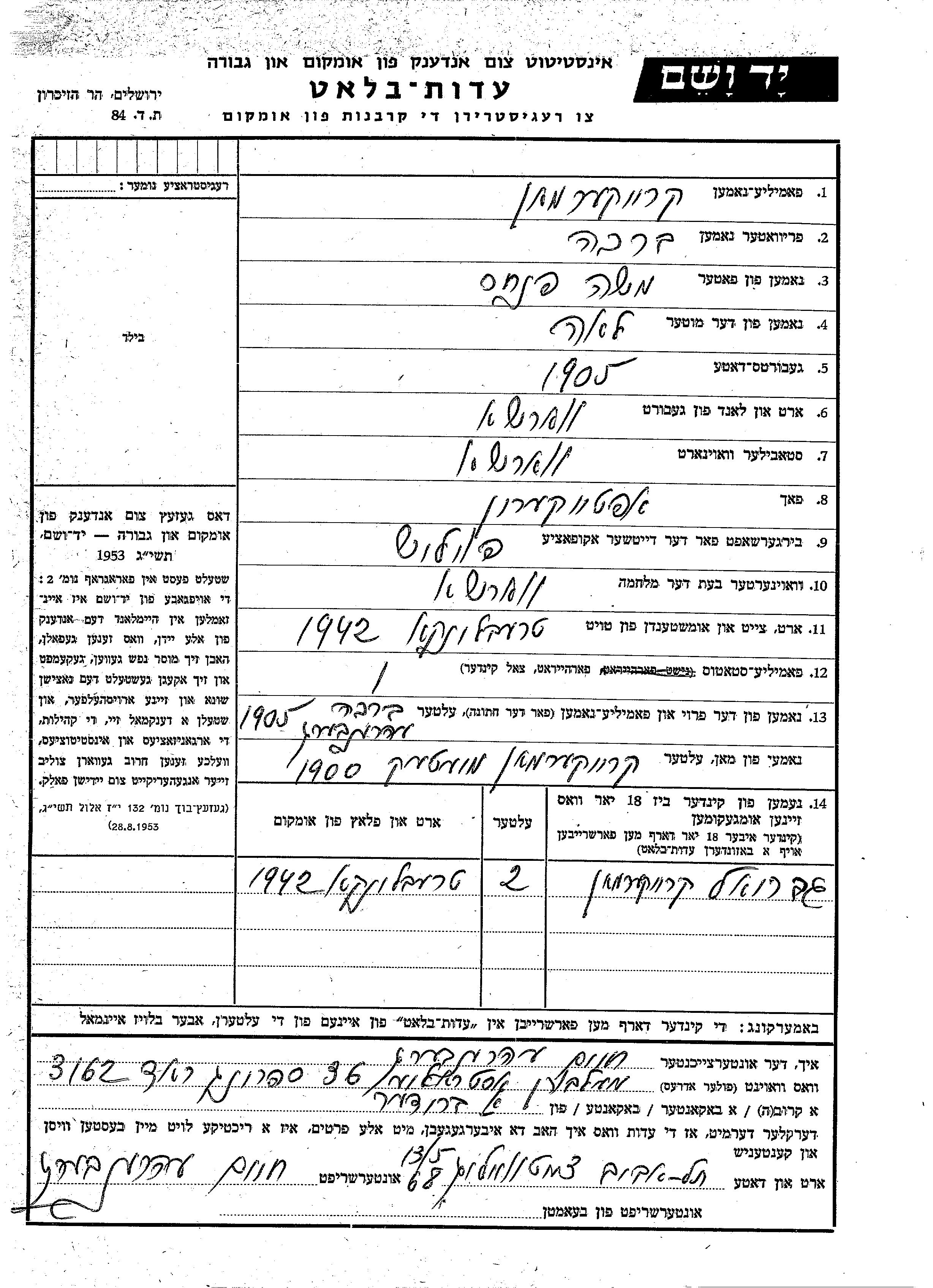 Kreikerman Brakha 1905 Warszawa, Pologne Feuille de témoignage