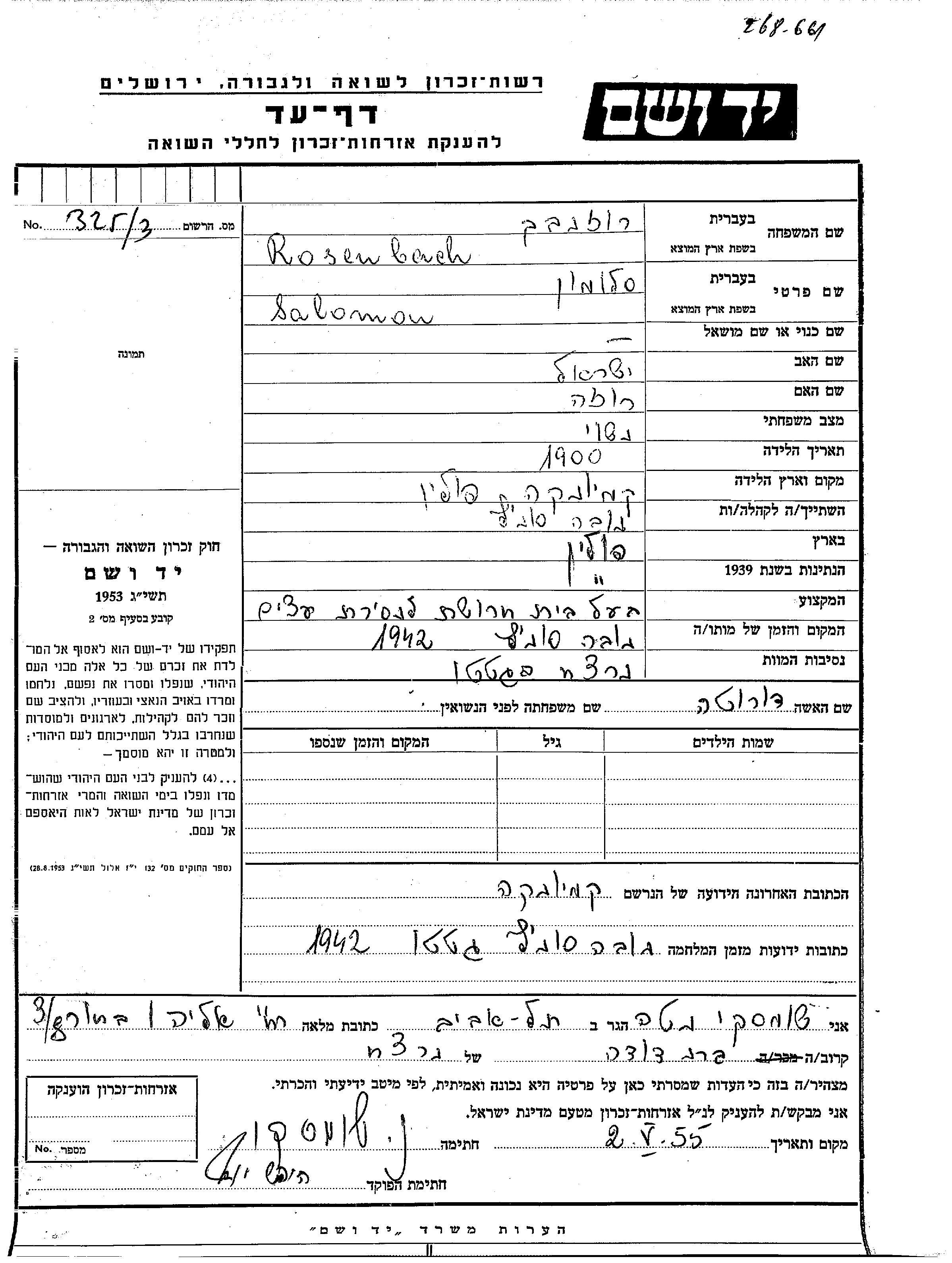 Salomon Rozenbach est né à Kamionka, Pologne en 1900, fils de Yisrael et de Roza. Il était בעל בית חרושת לנסורת עצים et Mariée à Dorota. Avant la seconde guerre mondiale il vivait à Kamionka, Pologne. Au cours de la guerre, il était à Nowy Sącz, Pologne.