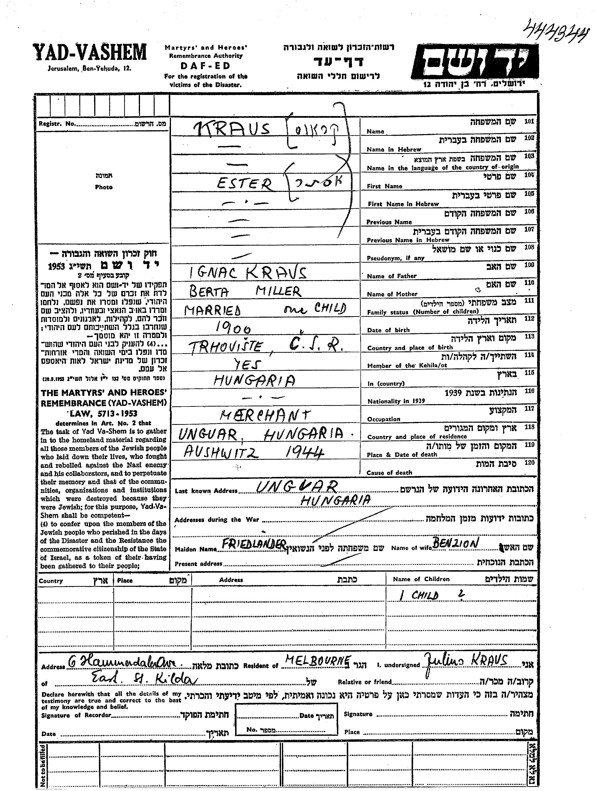 Kraus Ester 1900 Unguar, Tchécoslovaquie Feuille de témoignage