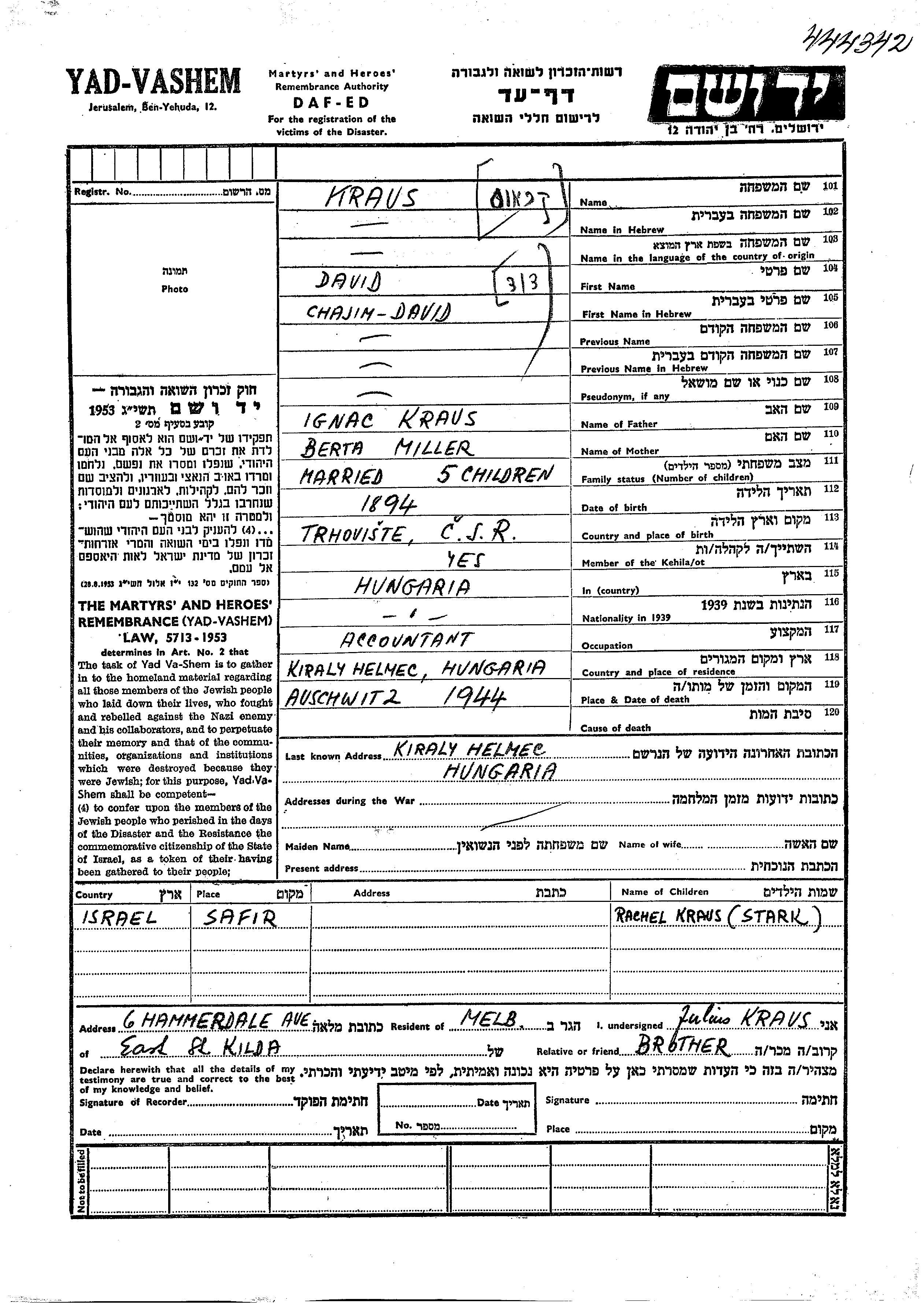 Kraus Chajim David 1894 Kiraly Helmec, Tchécoslovaquie Feuille de témoignage
