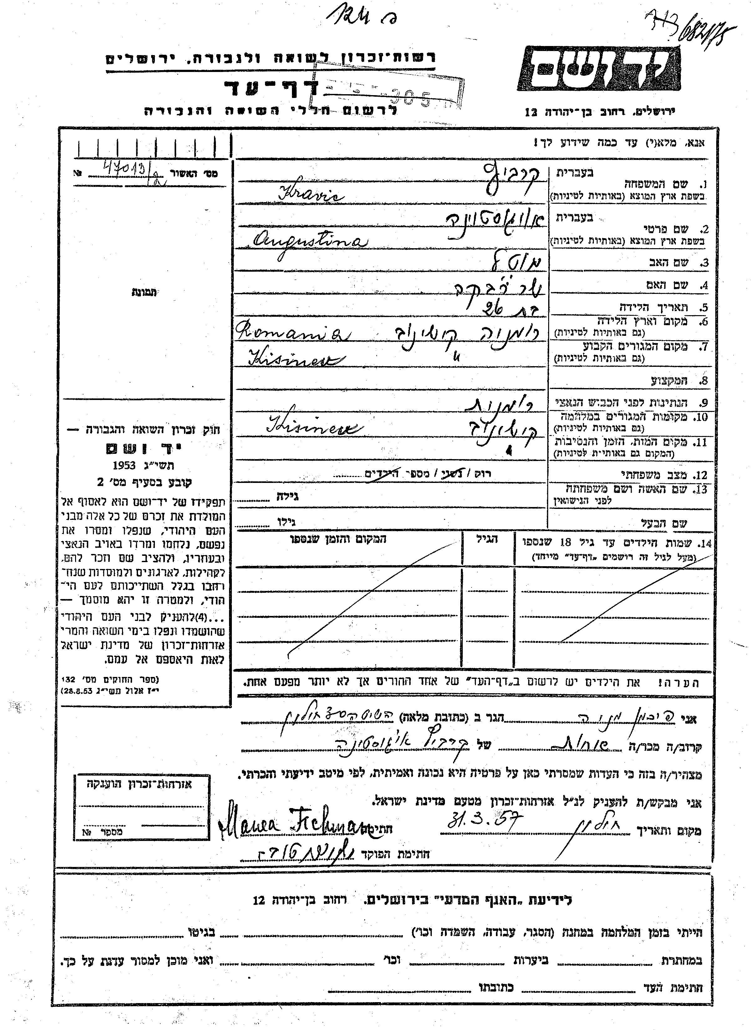 Augustina Kravic est née à Kishinev, Roumanie, fille de Motel et de Rivka. Elle était Célibataire. Avant la seconde guerre mondiale elle vivait à Kishinev, Roumanie. Pendant la guerre, elle était à Kishinev, Roumanie.