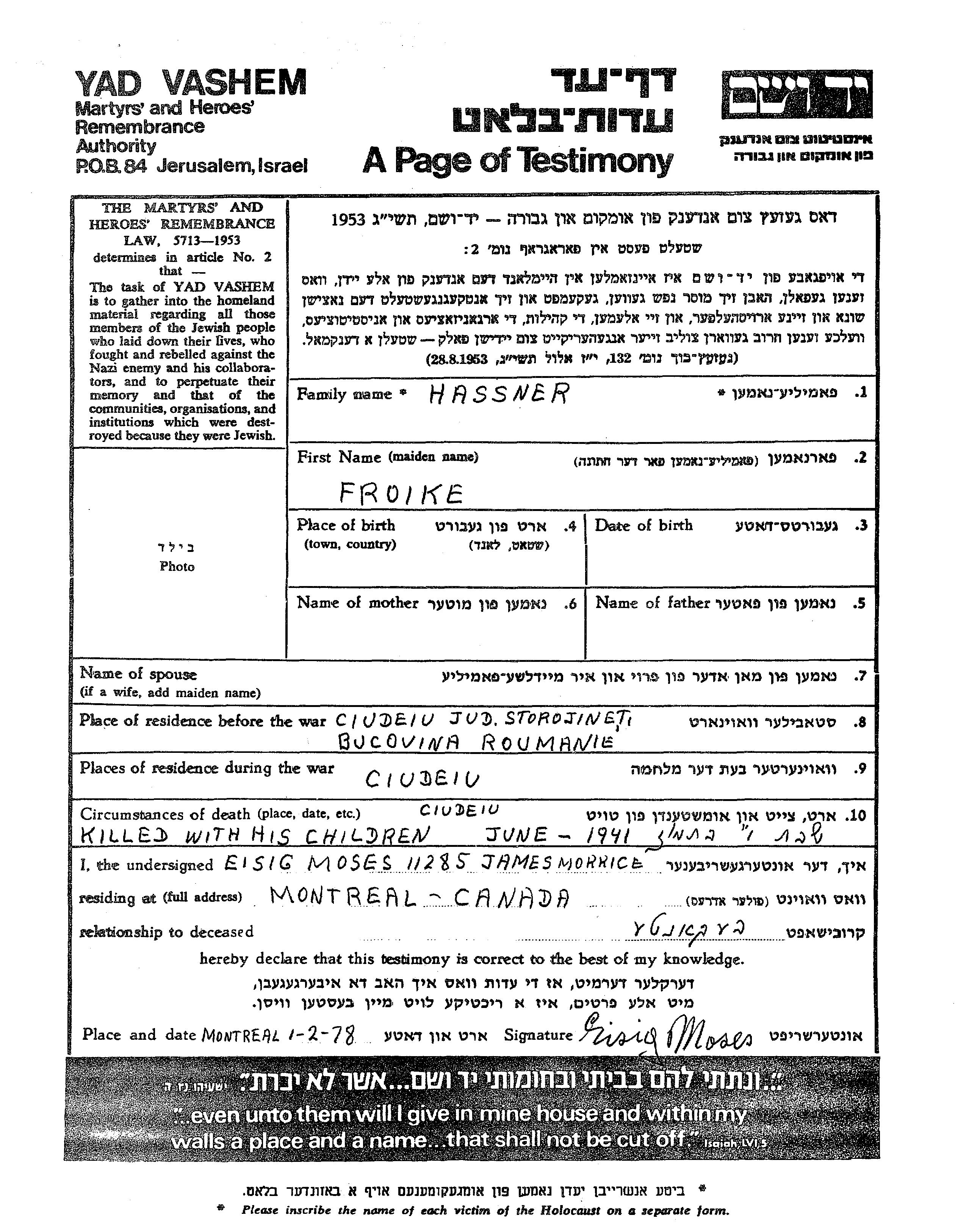 Froike Hassner. Avant la seconde guerre mondiale il vivait à Ciudeiu, Roumanie. Au cours de la guerre, il était à Ciudeiu, Roumanie.