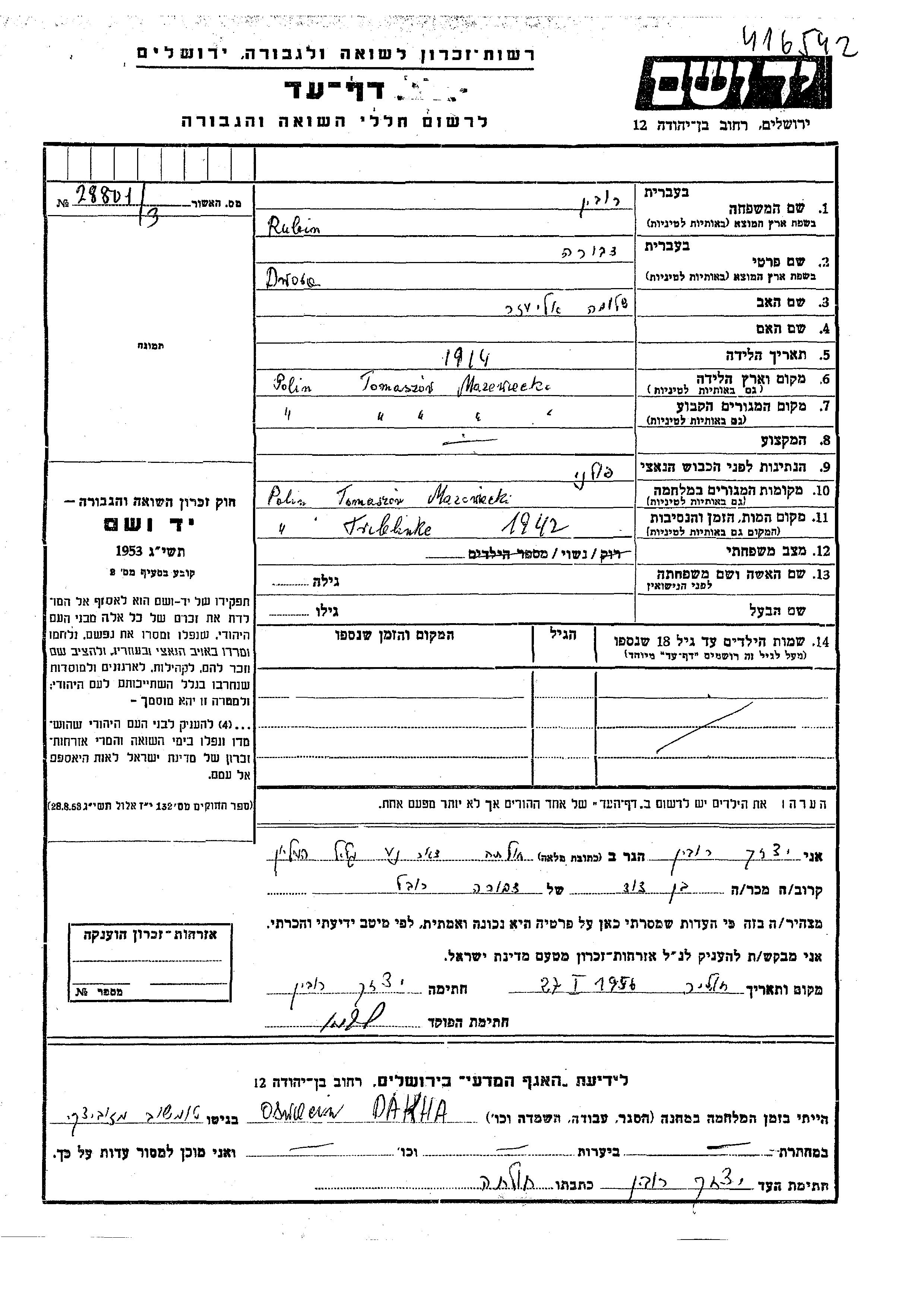 Rubin Dwora 1914 Tomaszow Mazowieckie, Pologne Feuille de témoignage