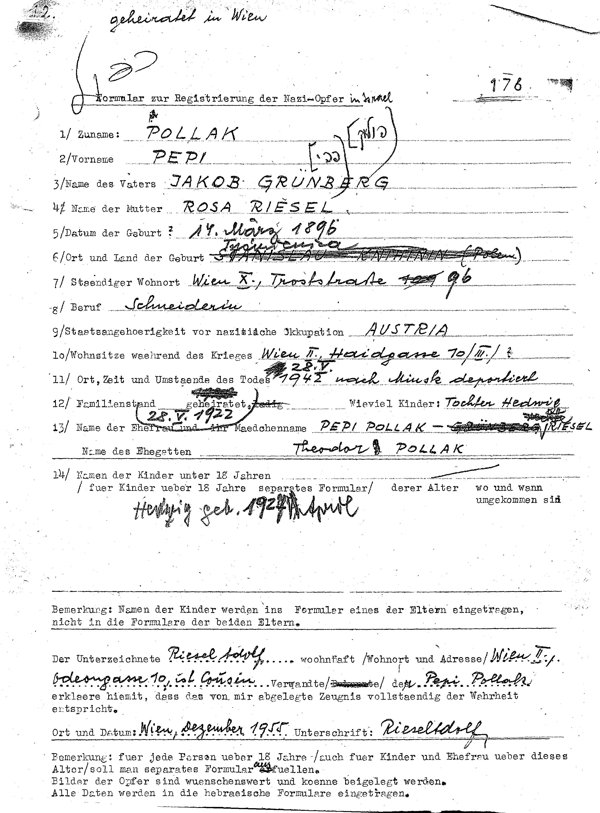 Pepi Pollak est née en 1896, fille de Jakob et de Rosa. Elle était Tailleur et Mariée à Theador. Avant la seconde guerre mondiale elle vivait à Wien, Autriche. Pendant la guerre, elle était à Autriche.