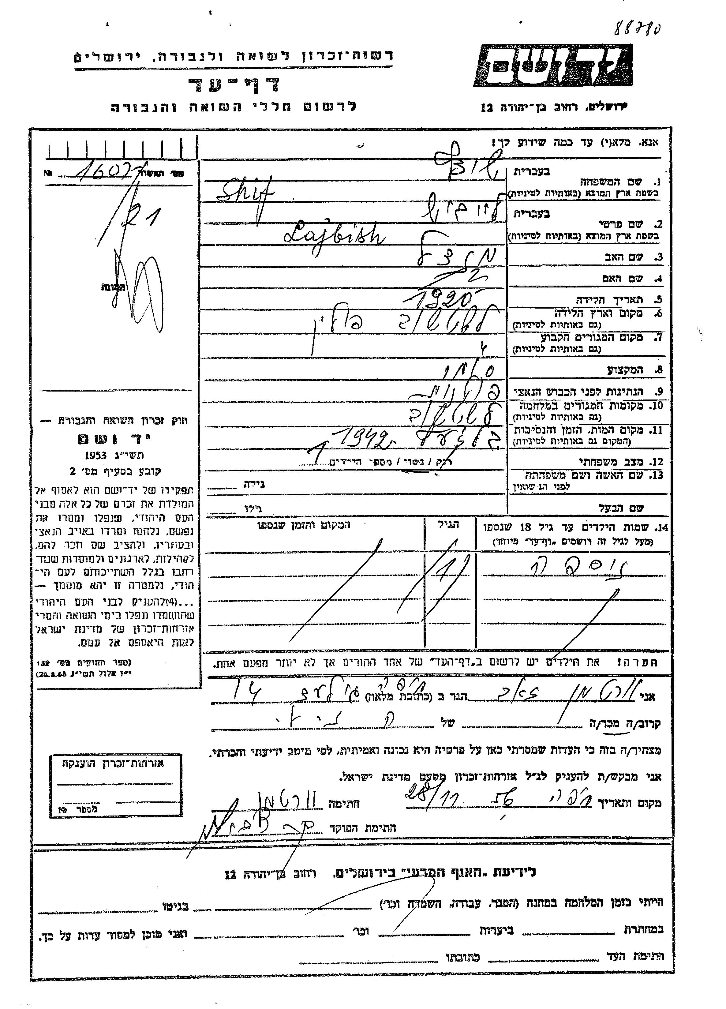 Shif Lajbish 1920 Laszczow, Pologne Feuille de témoignage