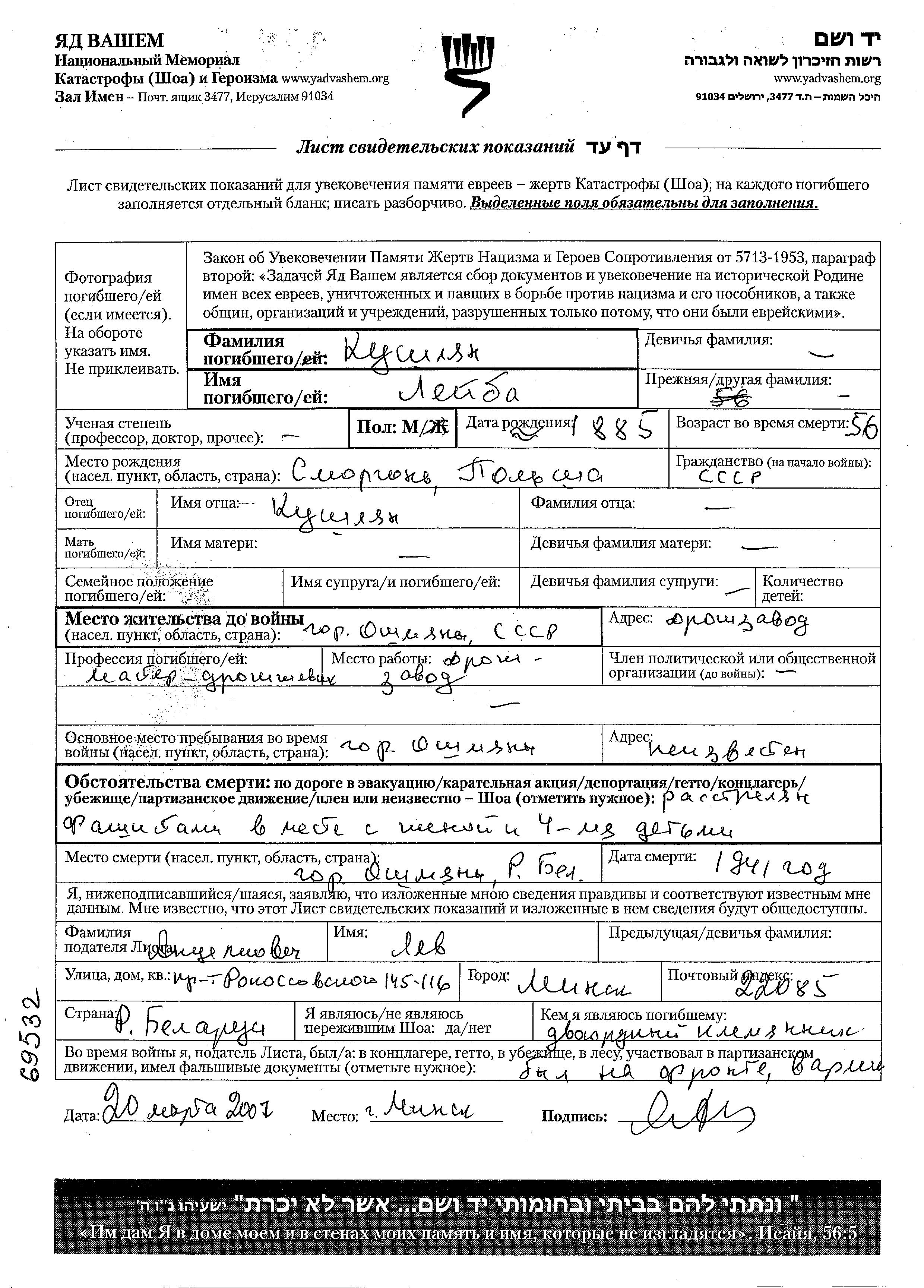 Leyba a été assassiné pendant la Shoah. Lieu de la mort: Oshmiany, Pologne en 1941.