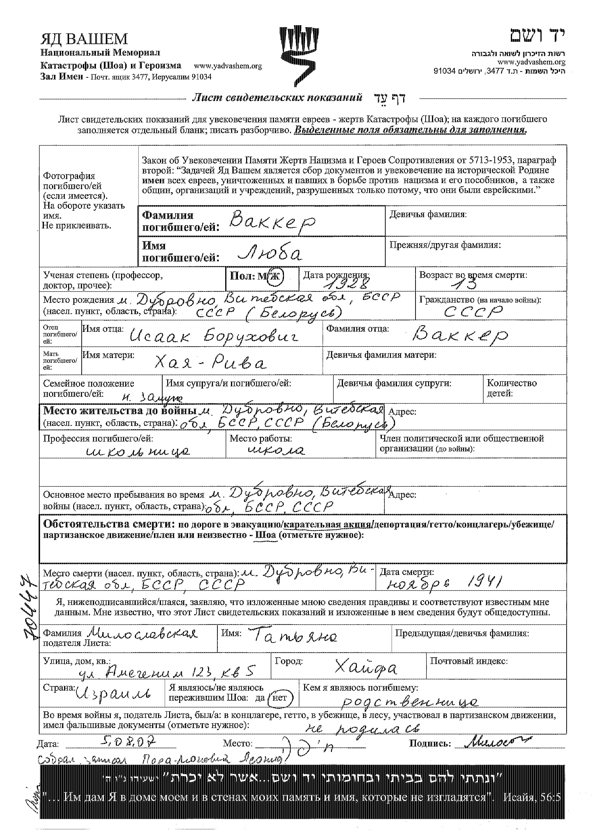 Vakker Lyuba 1928 Dubrovno, Bélorussie (URSS) Feuille de témoignage