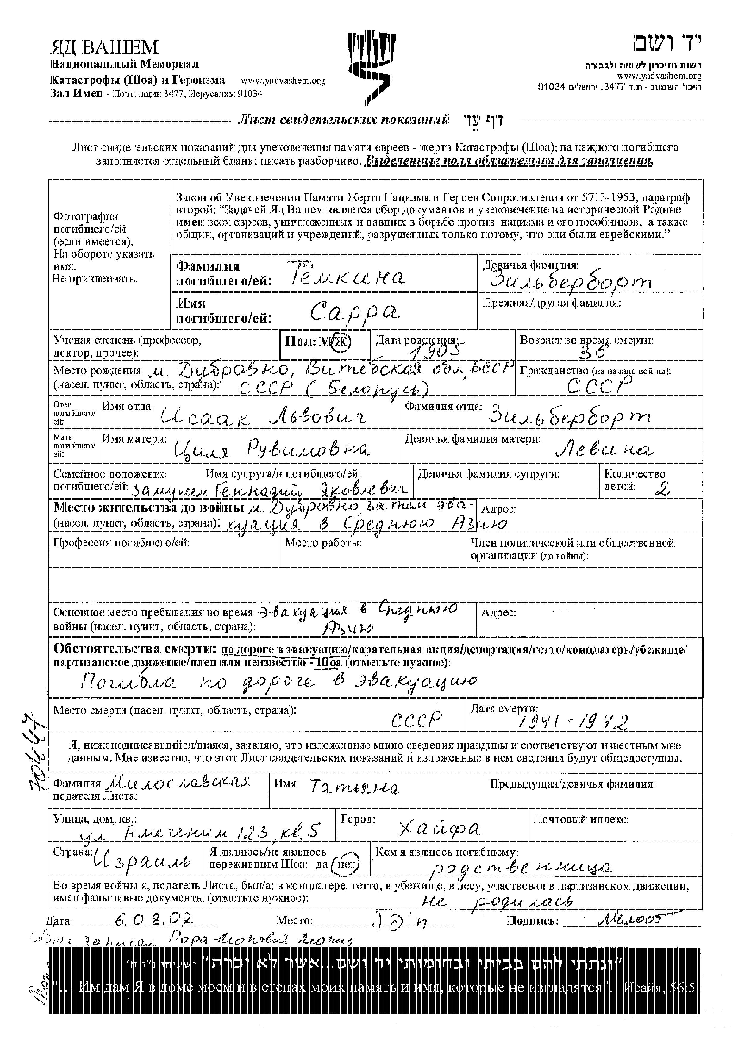 Tyomkina Sarra 1905 Dubrovno, Bélorussie (URSS) Feuille de témoignage