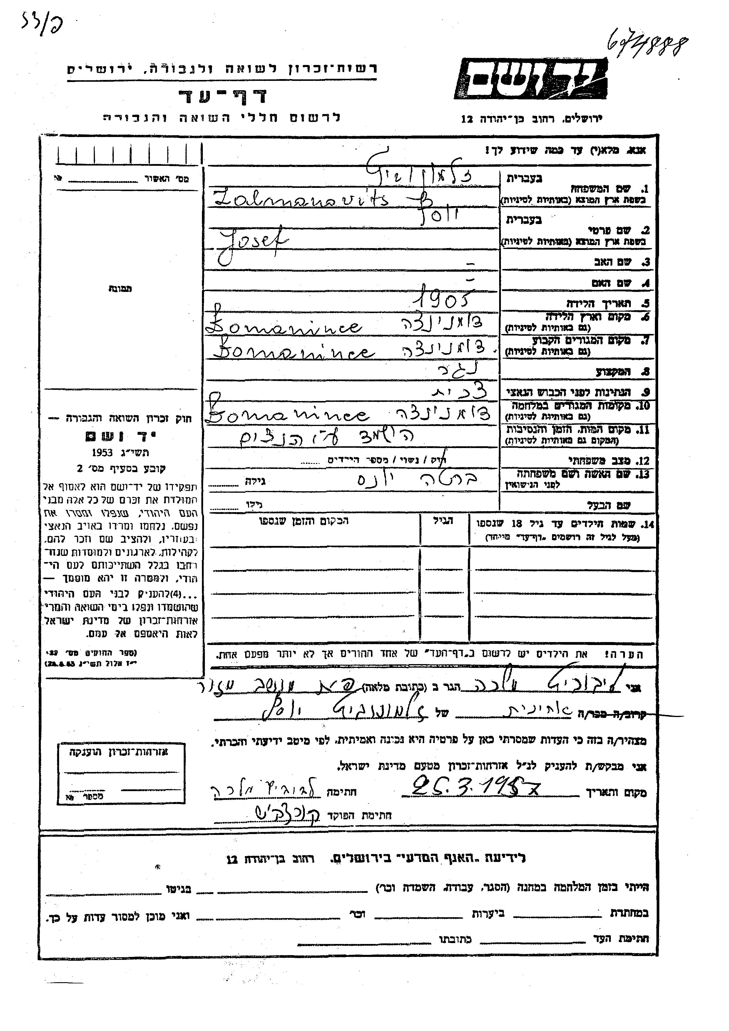 Zalmanovits Josef 1905 Domanince, Tchécoslovaquie Feuille de témoignage