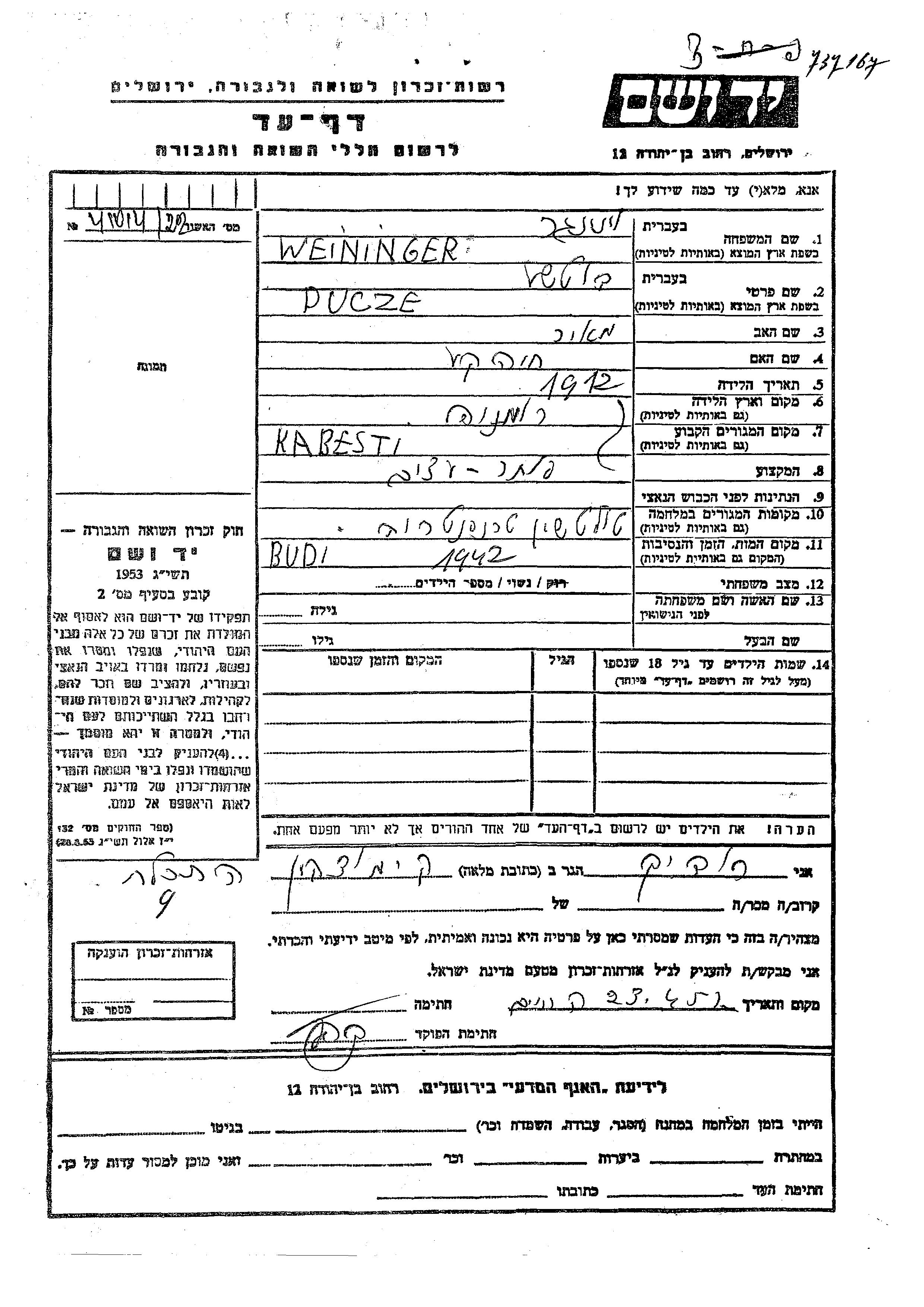 Ducze Weininger est né à Kabeshti, Roumanie en 1912, fils de Meir et de Khaia. Il était Négociant en bois et Marié. Avant la seconde guerre mondiale il vivait à Kabeshti, Roumanie. Au cours de la guerre, il était à Transnistria, Ukraine (URSS).
