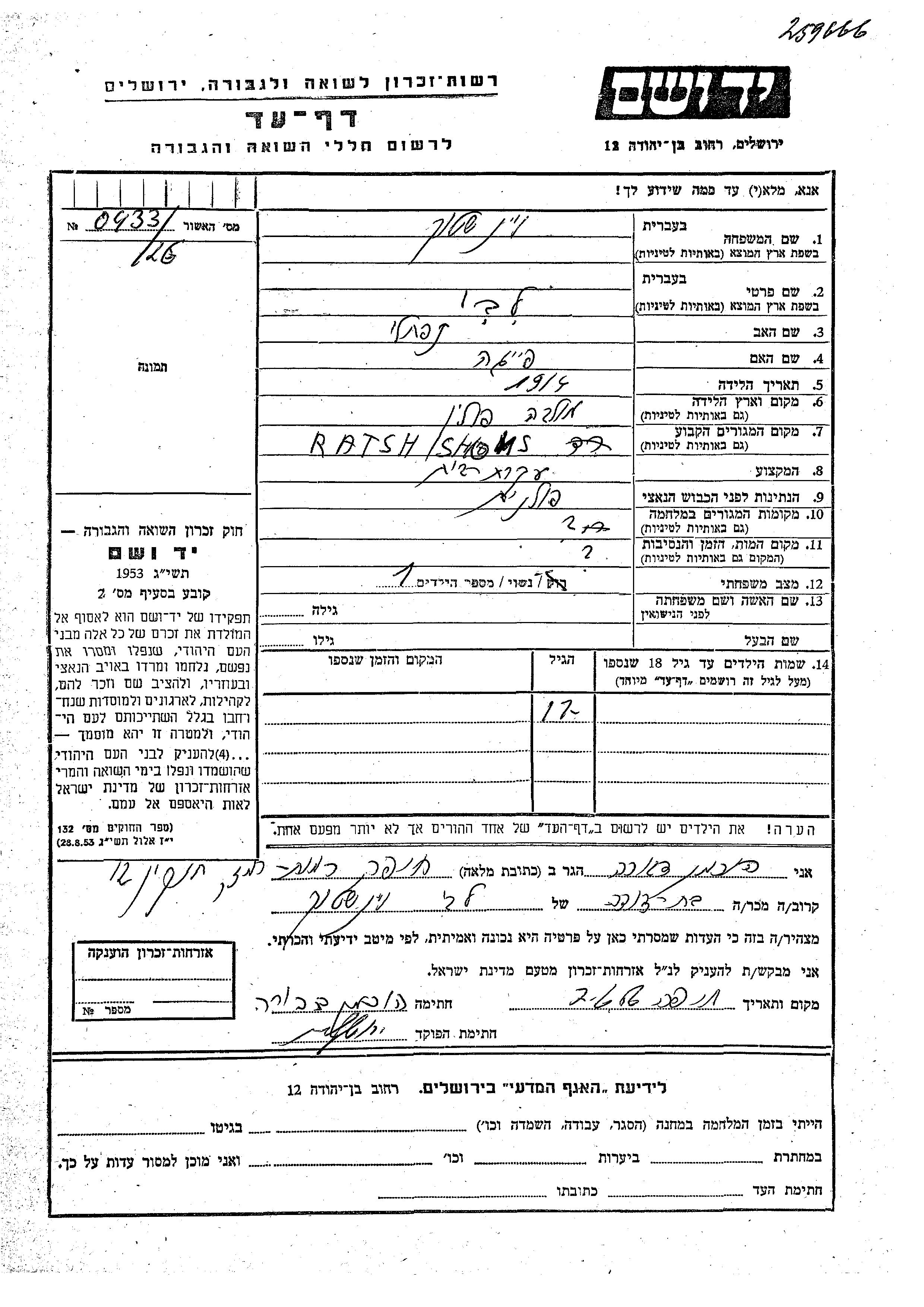 Yad Vashem - Pages of Testimony Names Memorial Collection