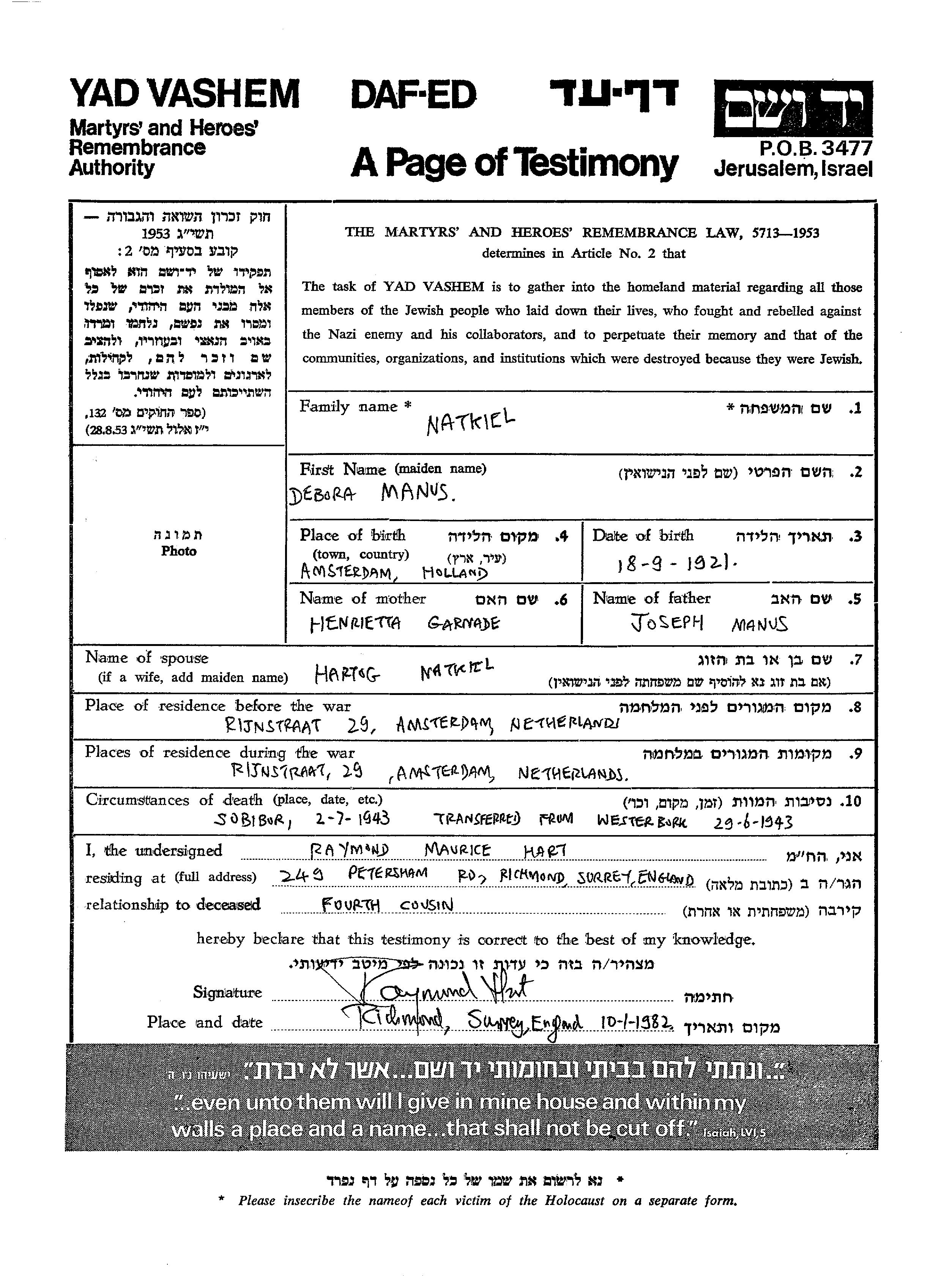 Natkiel Debora 1921 Amsterdam, Pays-Bas Feuille de témoignage
