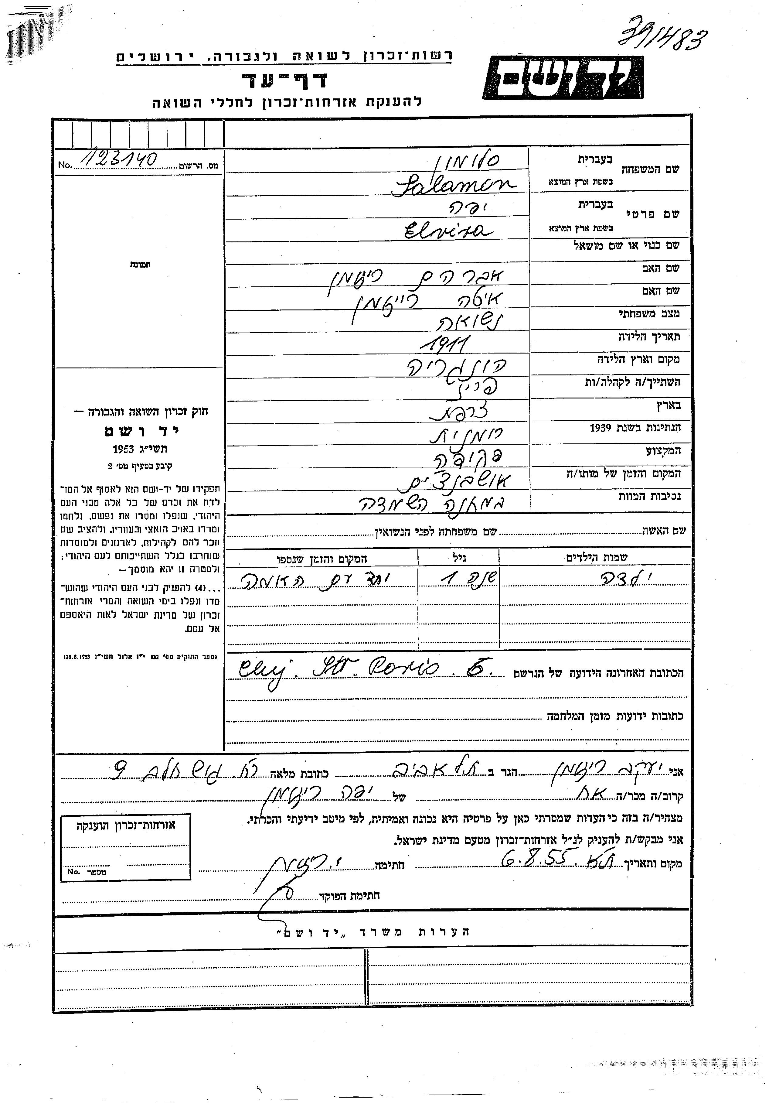 Elvira Yafa Salomon née Reizman est née à Hongrie en 1911, fille de Avraham et de Ita. Elle était Employé/e de bureau et Mariée. Avant la seconde guerre mondiale elle vivait à Paris, France.
