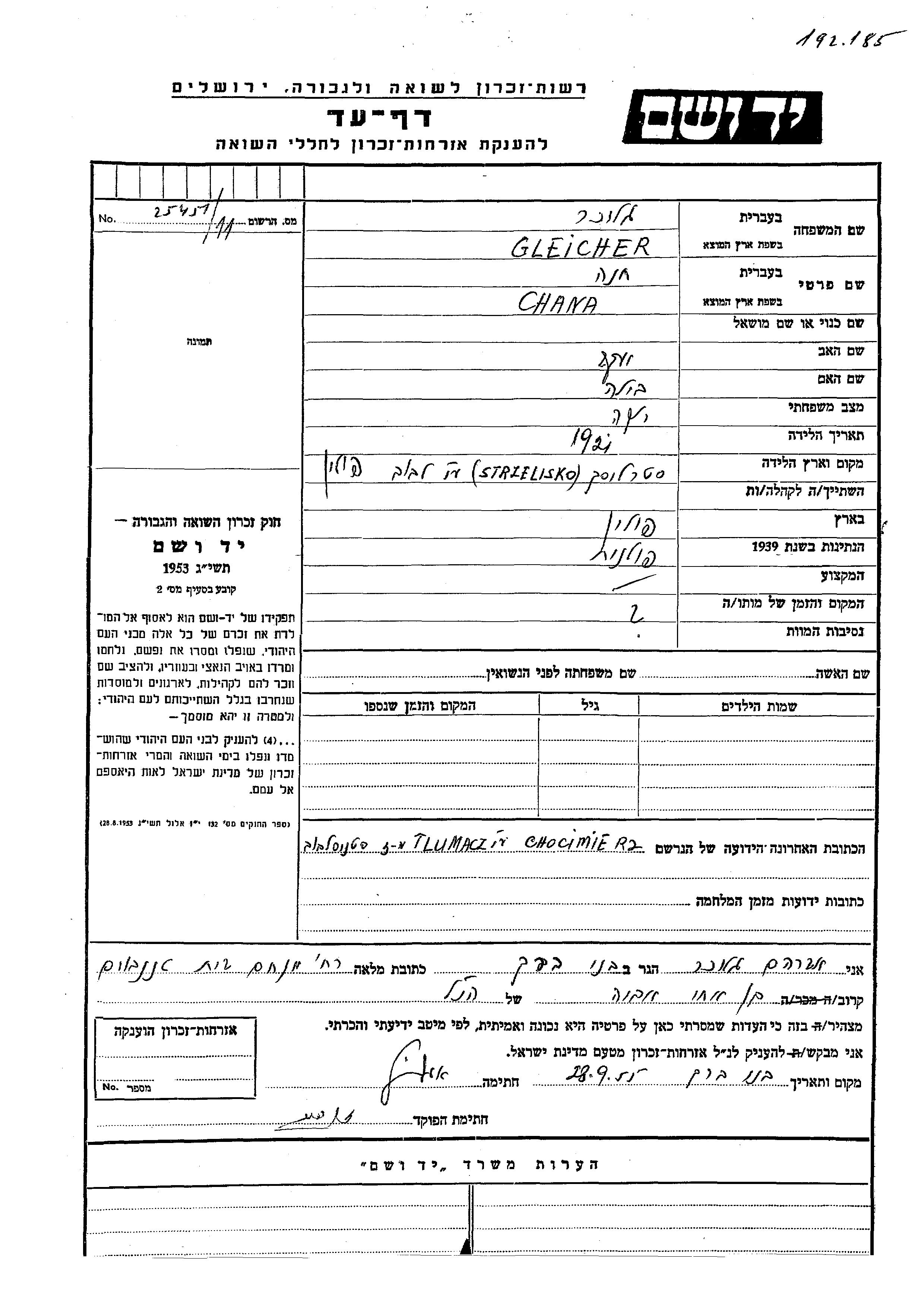 Gleicher Chana 1921 endroit inconnu, Feuille de témoignage
