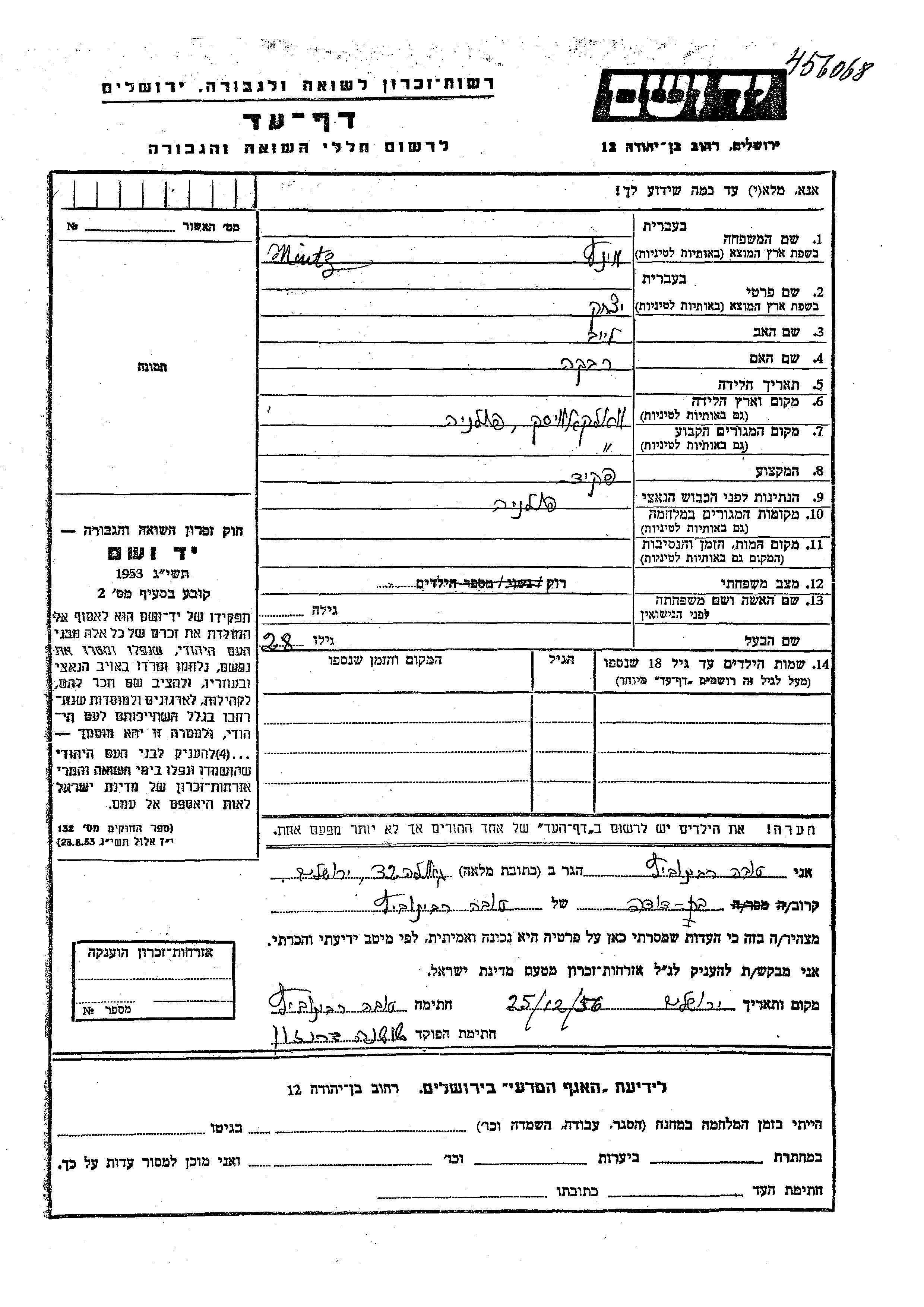 Yitzkhak Mintz est né à Wolkowisk, Pologne, fils de Leib et de Rivka. Il était Employé/e de bureau et Célibataire. Avant la seconde guerre mondiale il vivait à Wolkowisk, Pologne.