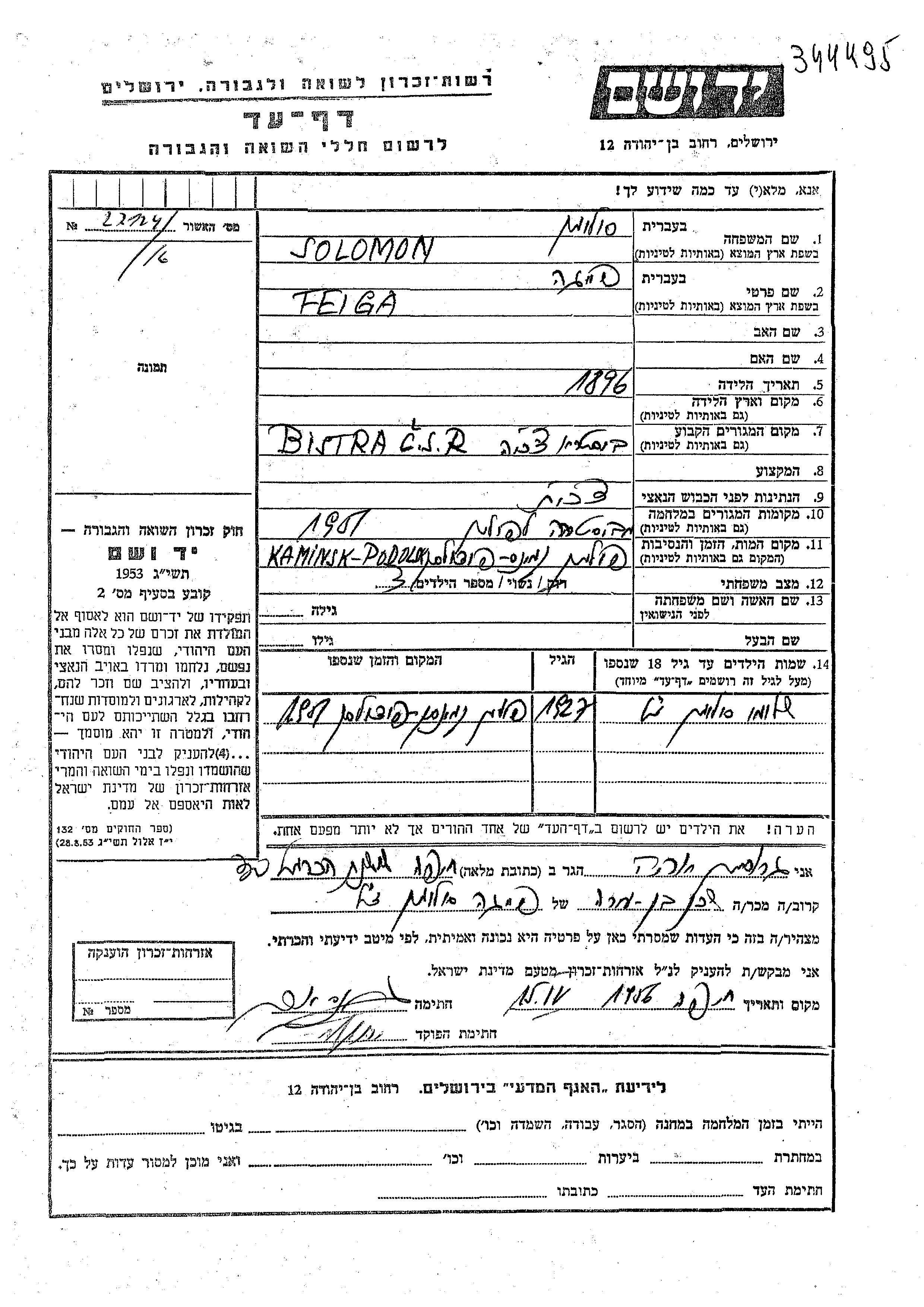 Solomon Feiga 1896 Bisztra, Tchécoslovaquie Feuille de témoignage