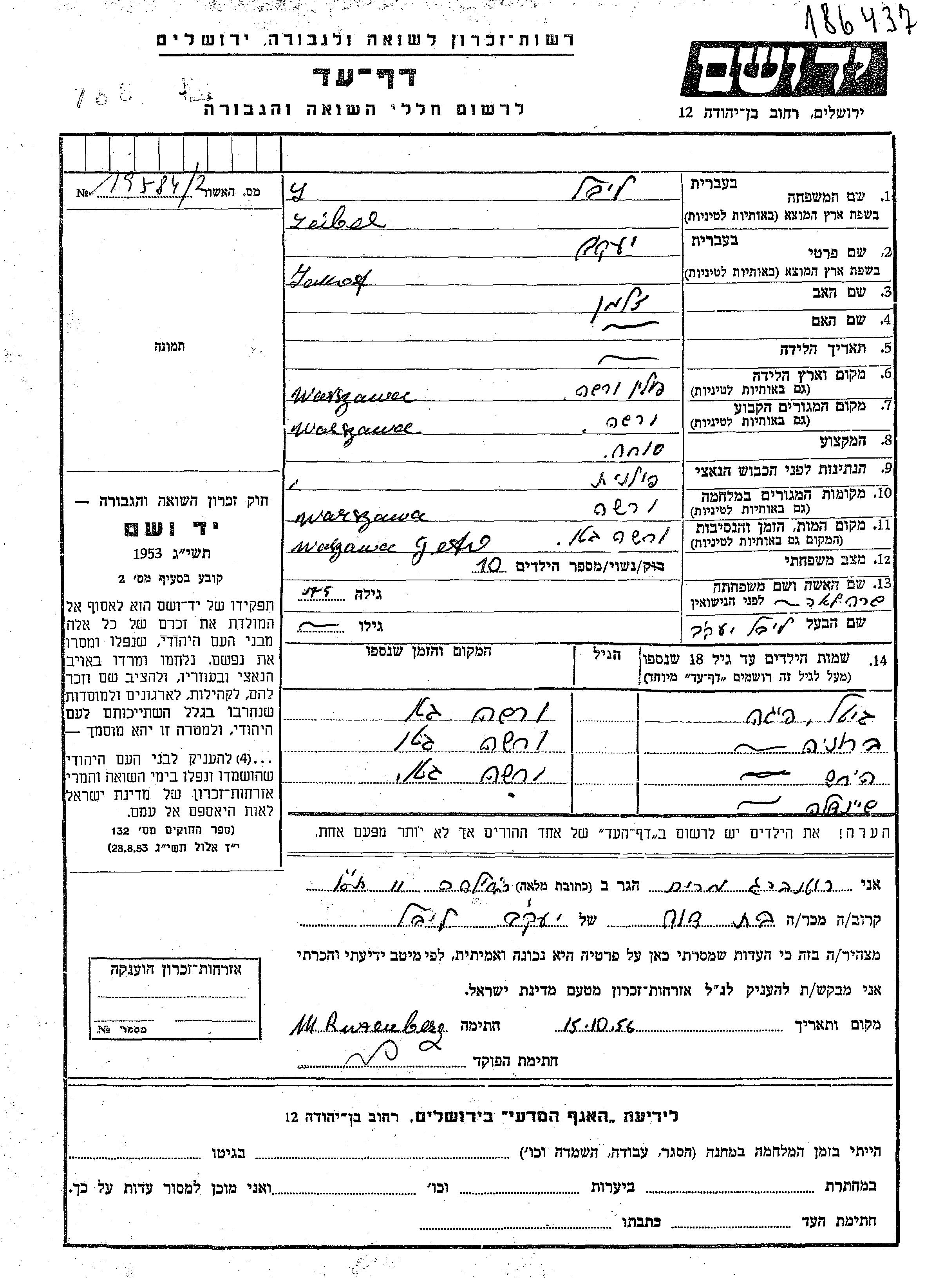 Leibel Libel Jaukof Warszawa, Pologne Feuille de témoignage
