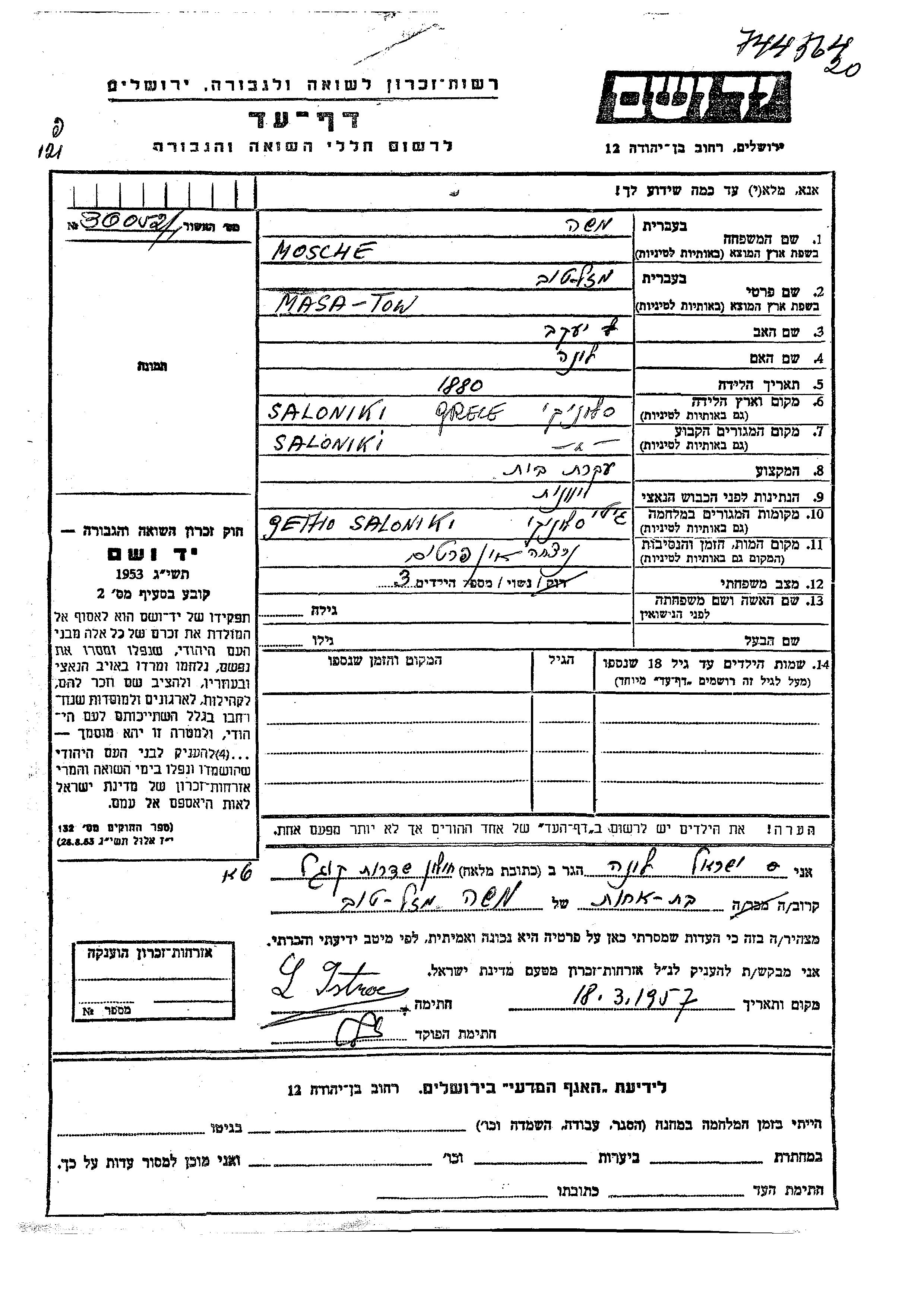 Masa Tow Mosche est née à Saloniki, Grèce en 1880, fille de Yaakov et de Lina. Elle était Femme au foyer et Mariée. Avant la seconde guerre mondiale elle vivait à Saloniki, Grèce. Pendant la guerre, elle était à Salonika, Grèce.