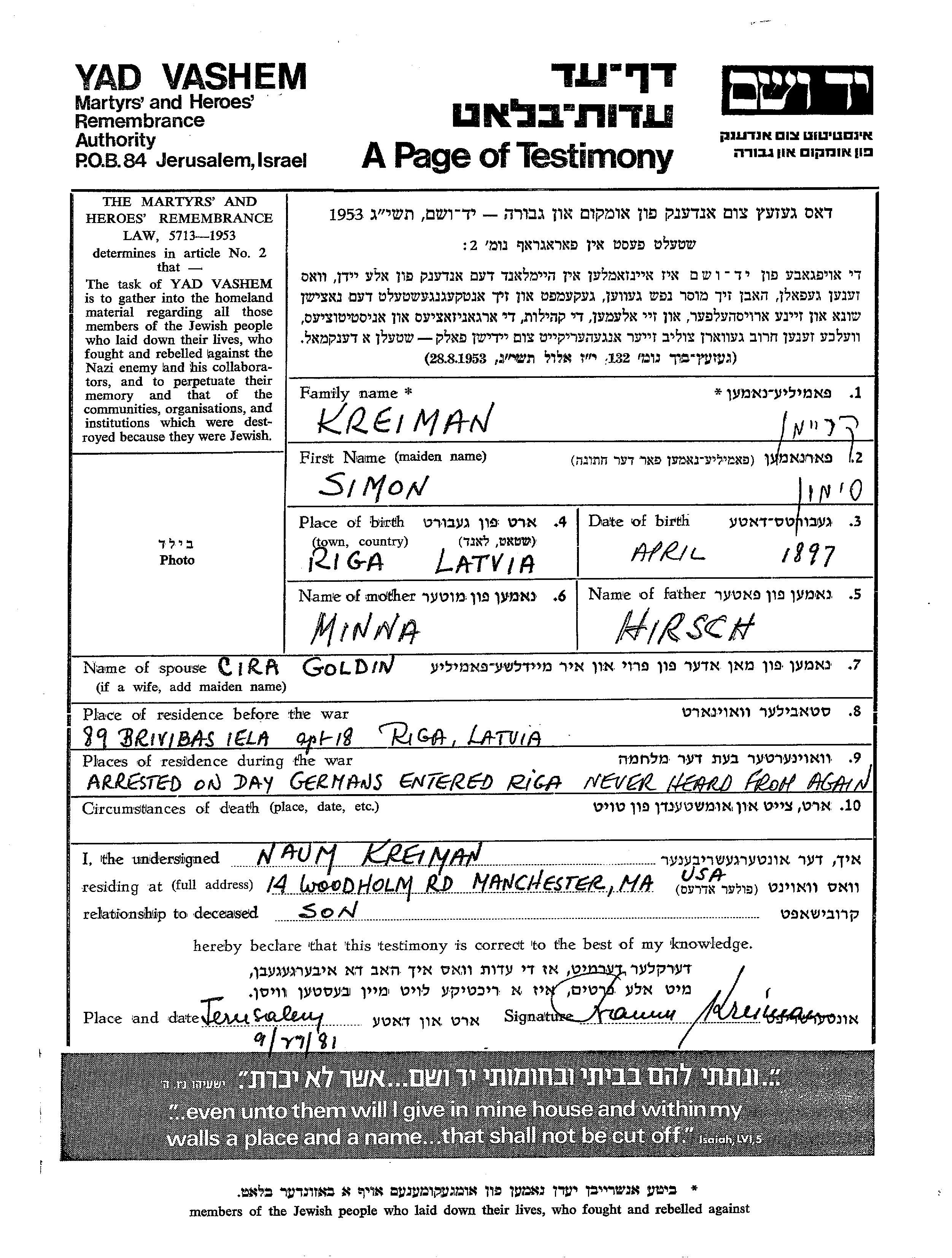 Kreiman Simon 1897 Riga, Lettonie Feuille de témoignage