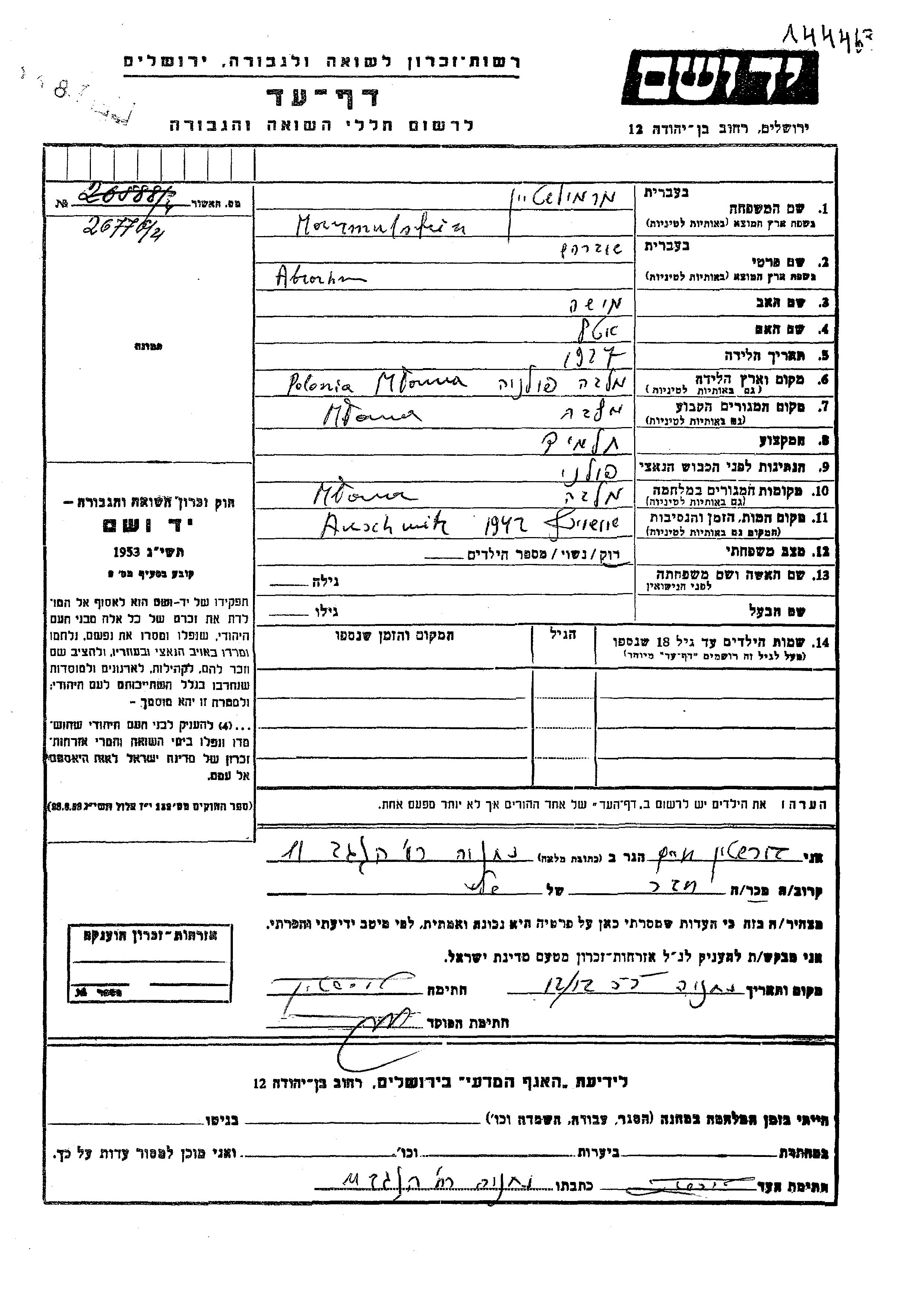Marmulstein Abrahm 1927 Mlawa, Pologne Feuille de témoignage