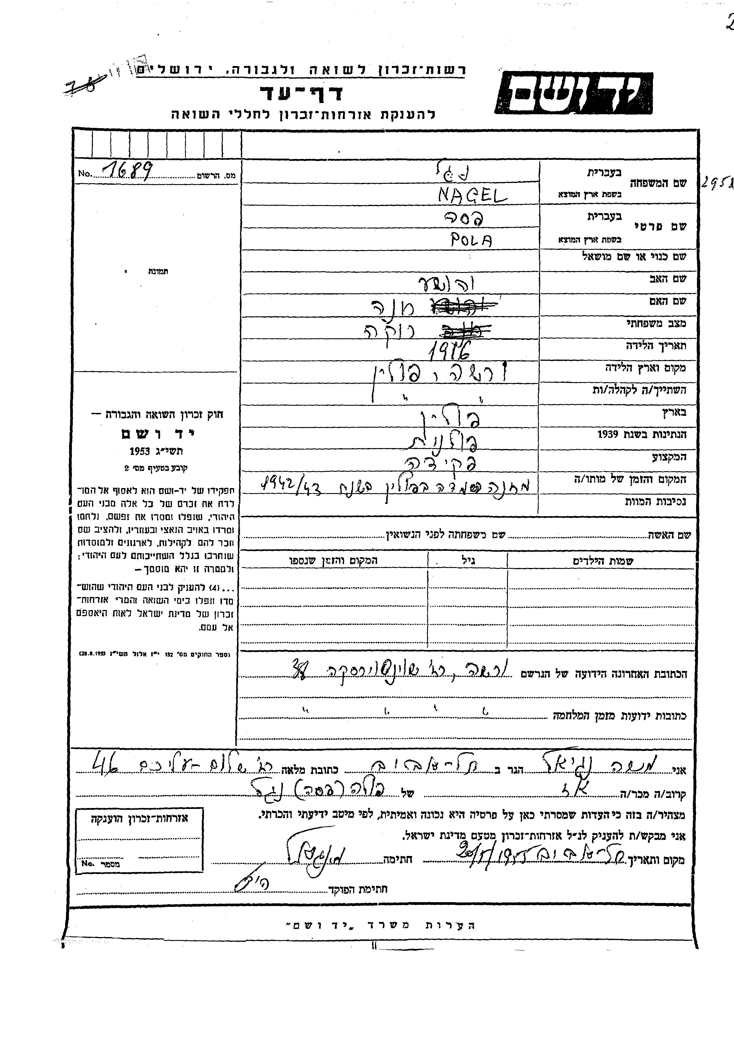 Pola Pesa Nagel est née à Warszawa, Pologne en 1916, fille de Yehoshua et de Khana. Elle était Employé/e de bureau et Célibataire. Avant la seconde guerre mondiale elle vivait à Warszawa, Pologne. Pendant la guerre, elle était à Warszawa, Pologne.