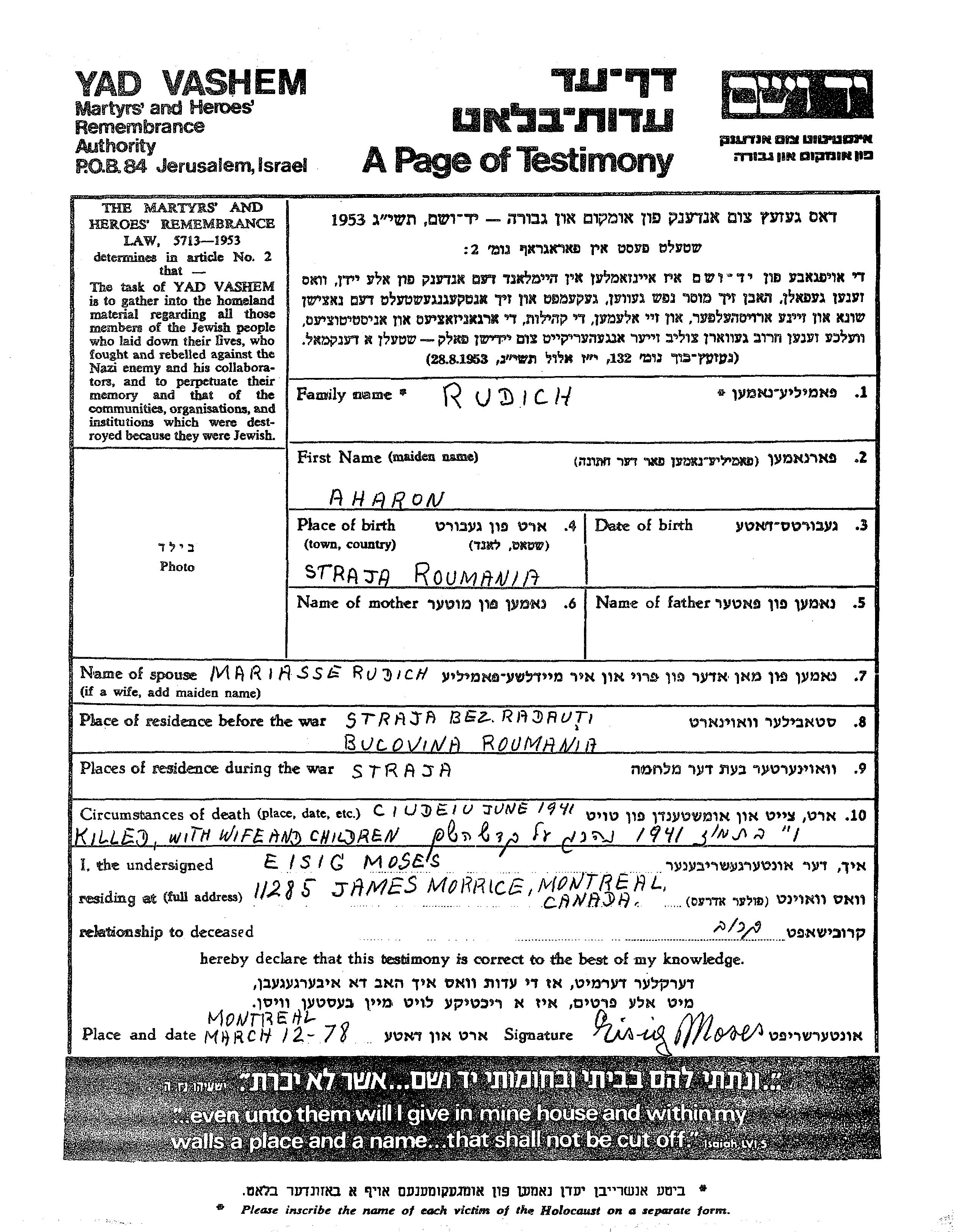 Rudich Aharon Straja, Roumanie Feuille de témoignage