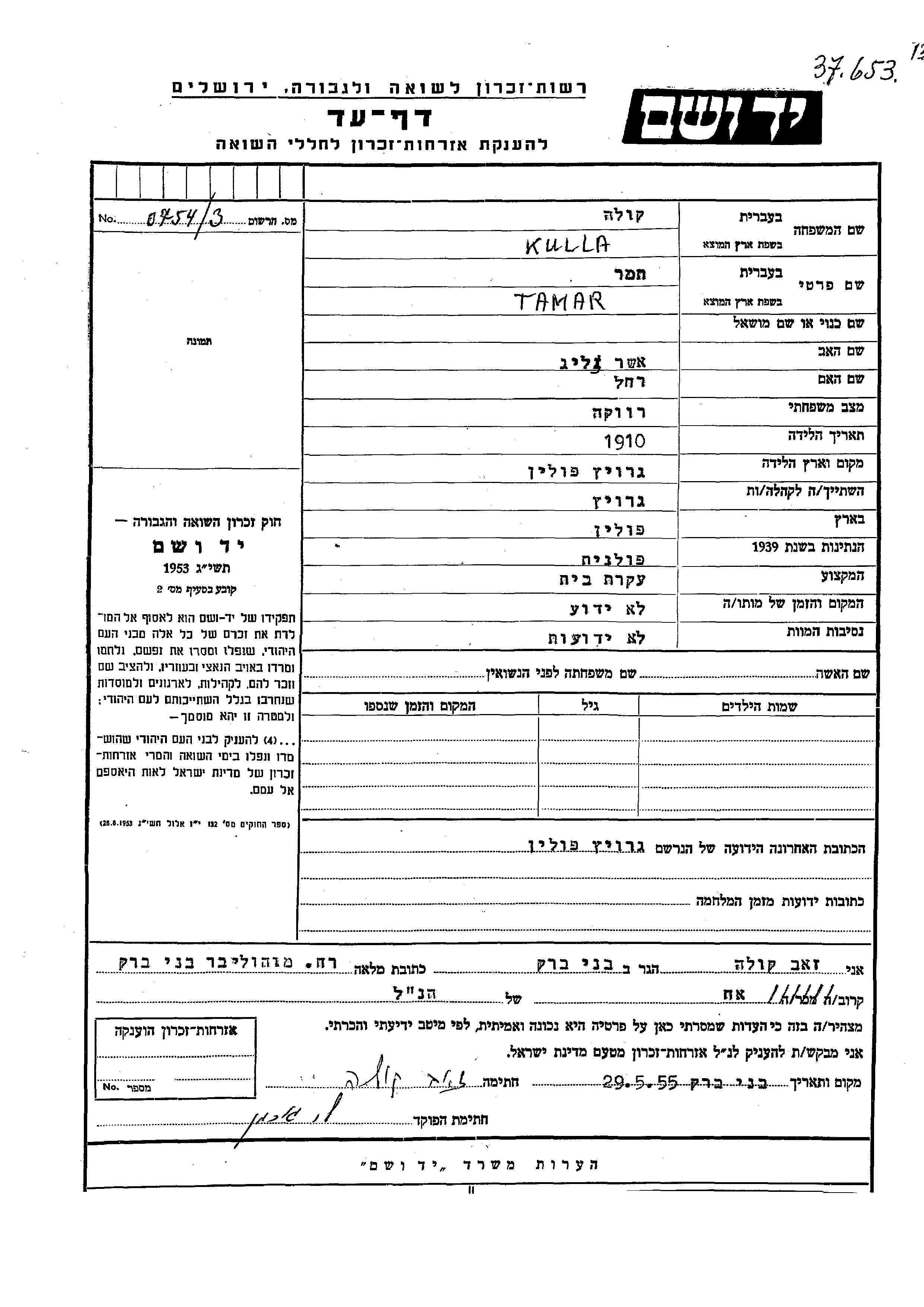 Tamar Kulla est née en 1910, fille de Asher Zelig et de Rakhel. Elle était Femme au foyer et Célibataire.