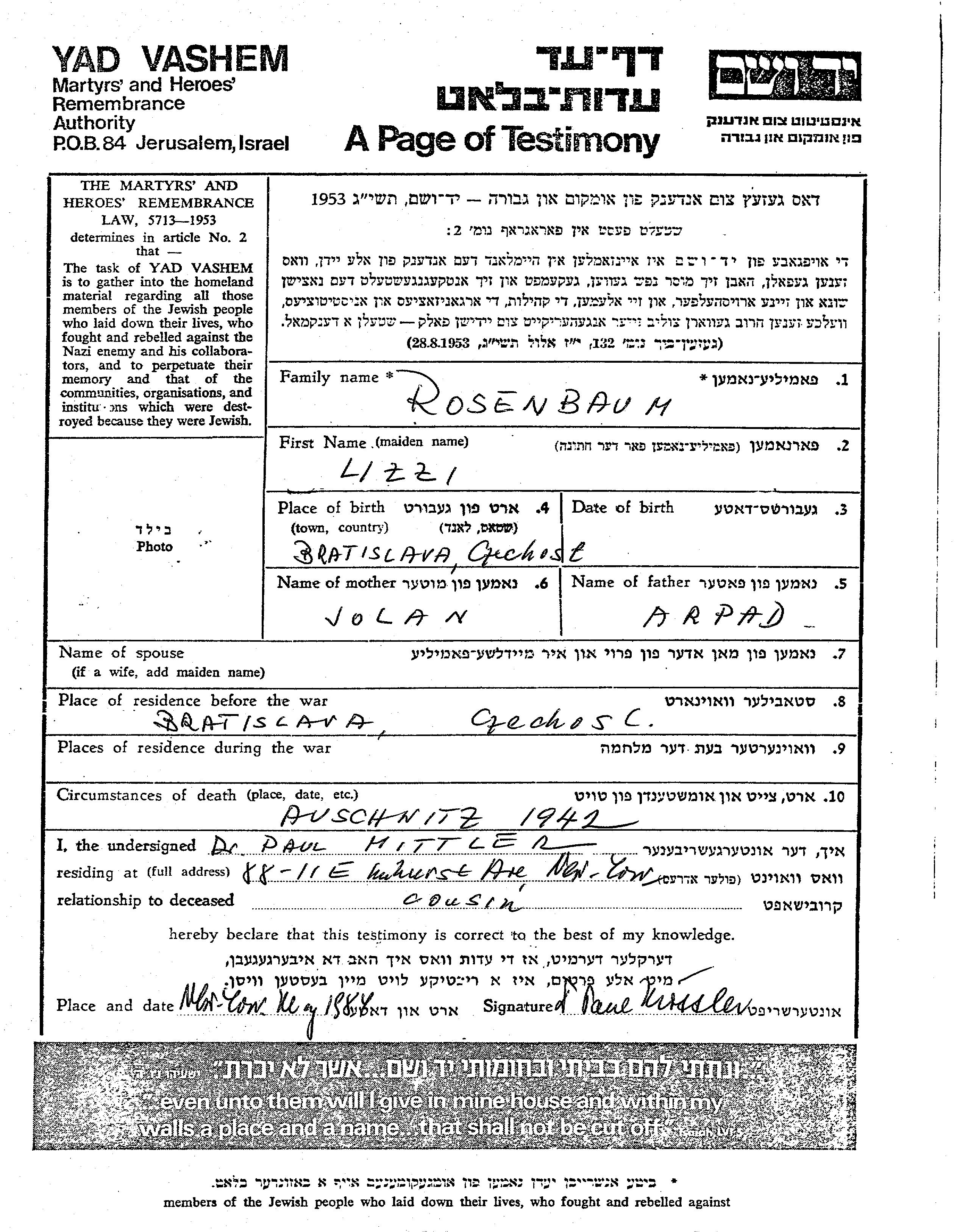 Rosenbaum Lizzi Bratislava, Tchécoslovaquie Feuille de témoignage