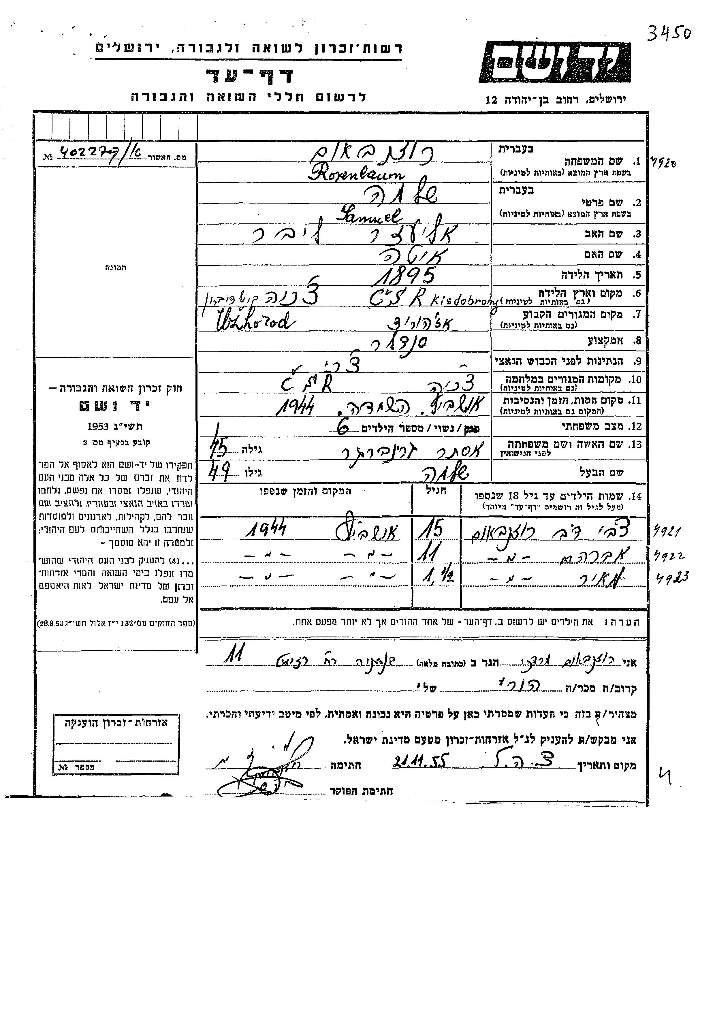Rosenbaum Shlomo Samuel 1895 Uzhhorod, Tchécoslovaquie Feuille de témoignage
