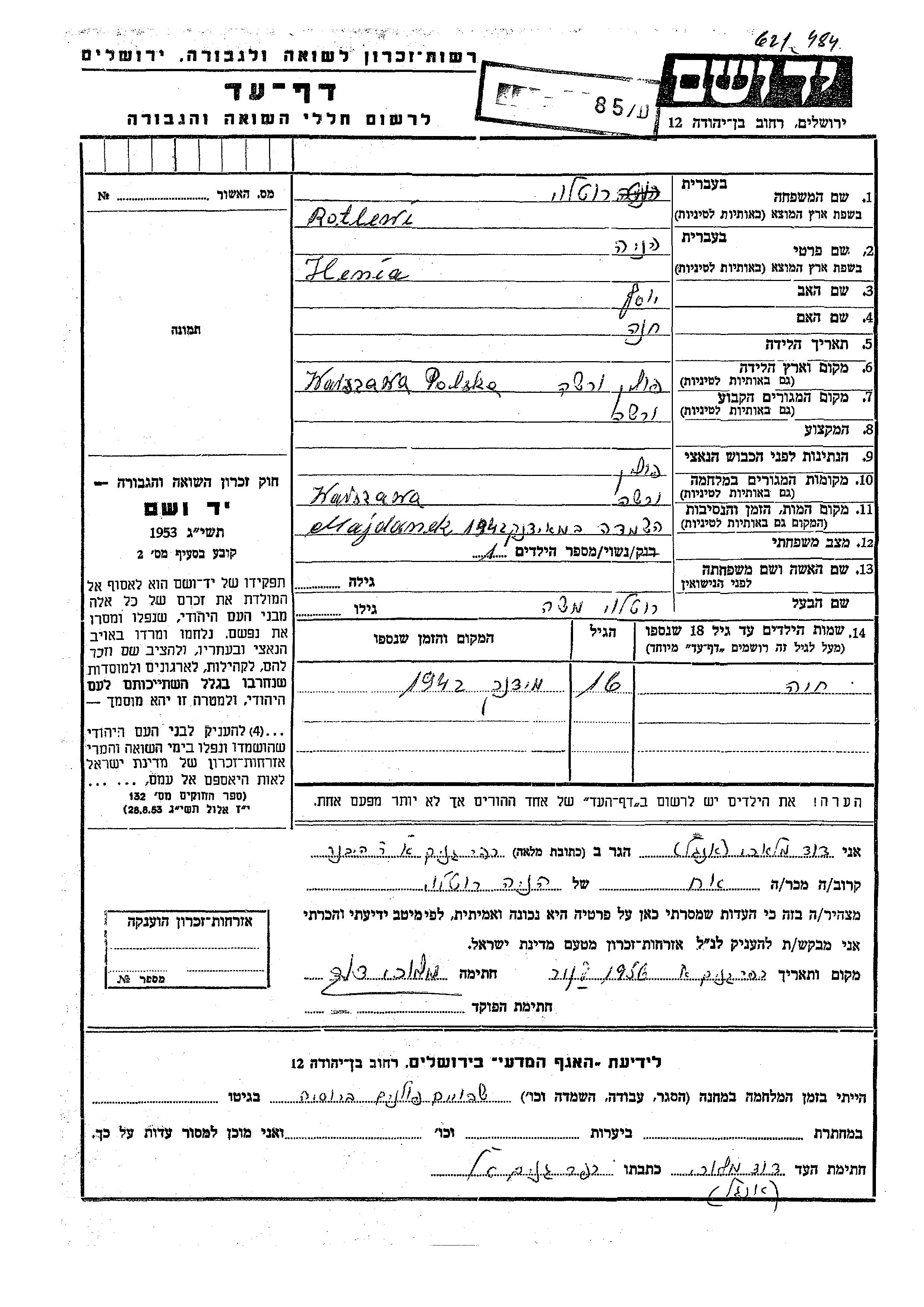 Rotlewi Henia Warszawa, Pologne Feuille de témoignage