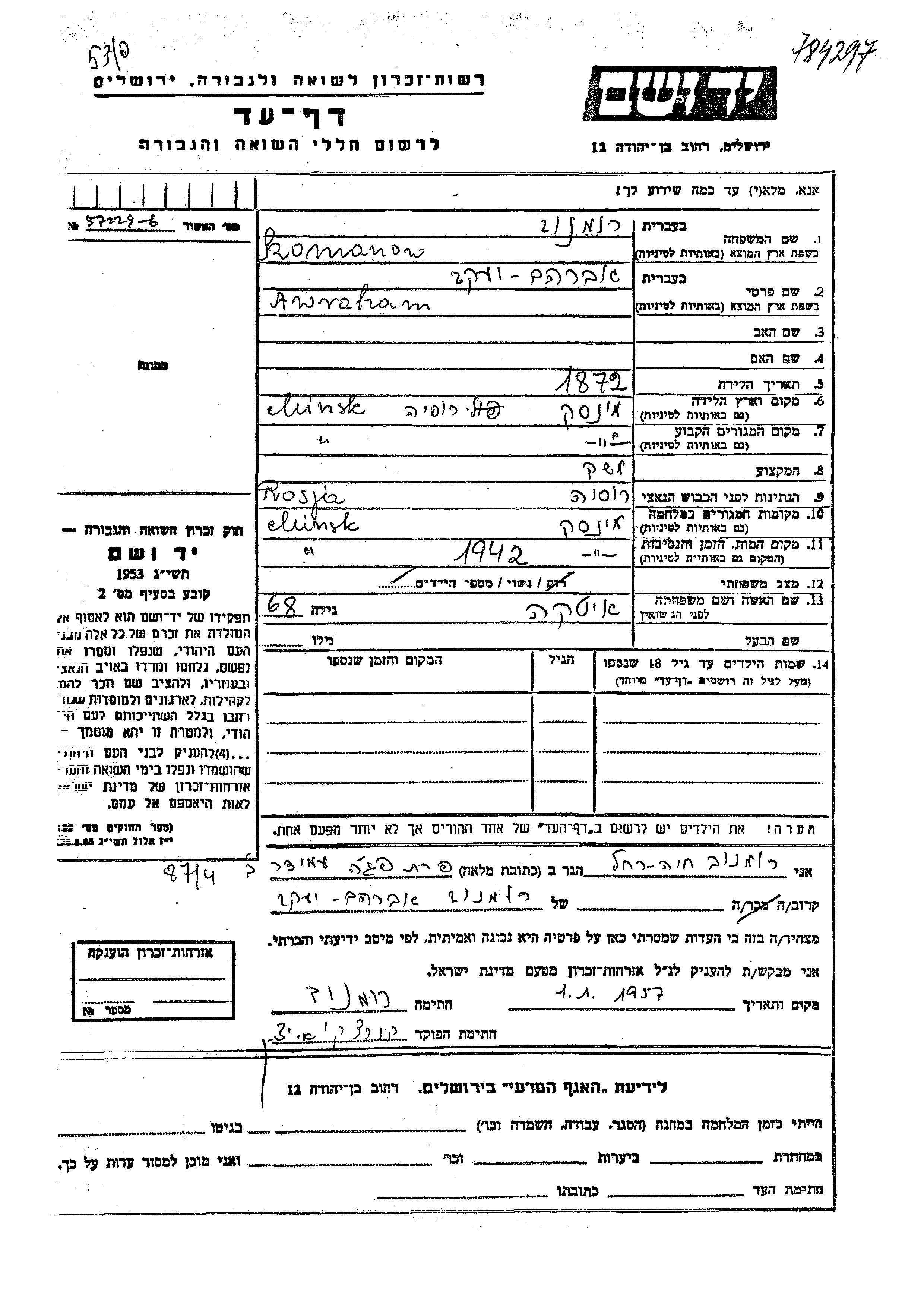Romanow Awraham Yaakov 1872 Minsk, Bélorussie (URSS) Feuille de témoignage