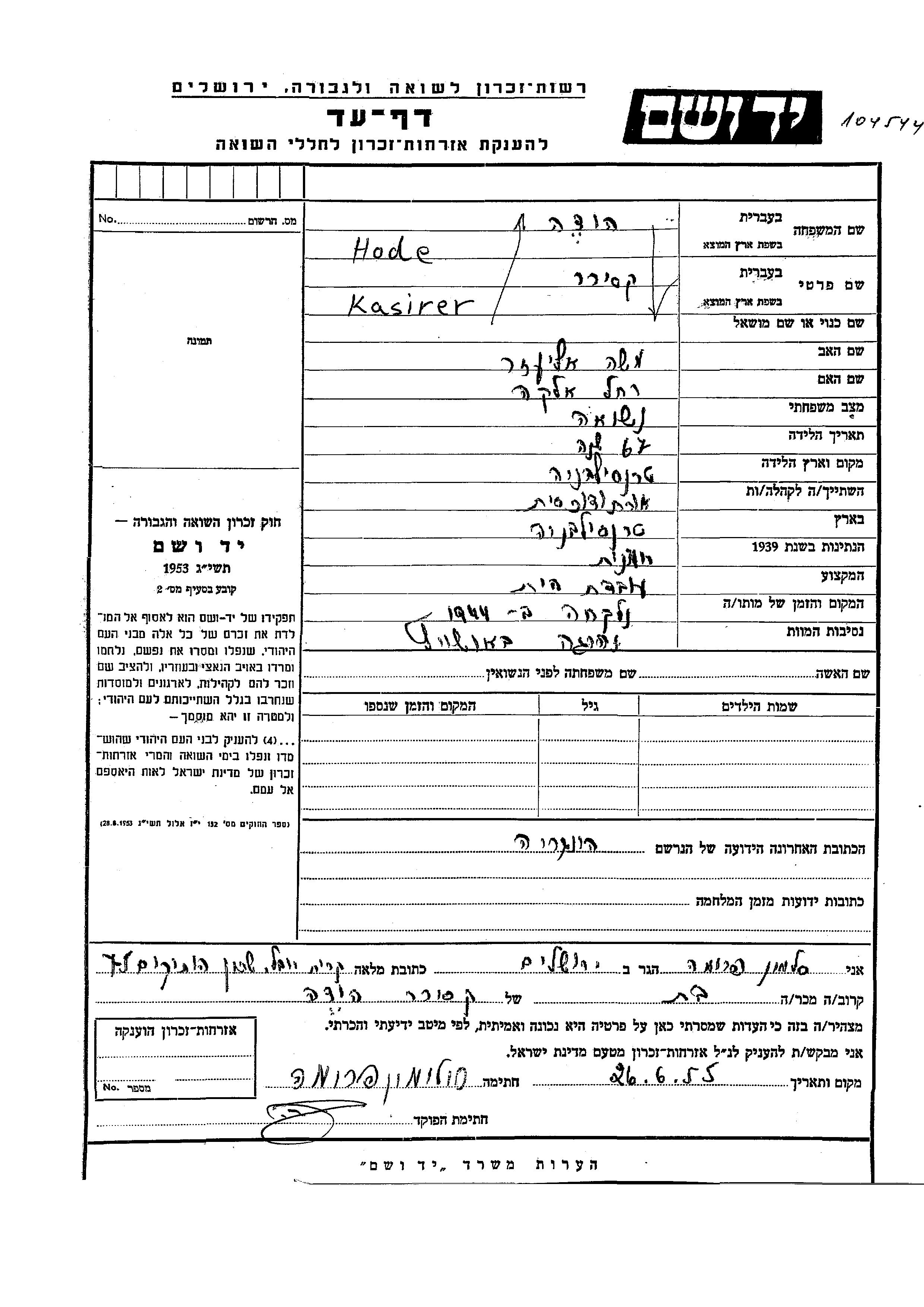 Hode Kasirer est née à Transylvania, Roumanie, fille de Moshe Eliezer et de Rakhel Elka. Elle était Femme au foyer et Mariée. Pendant la guerre, elle était à Hongrie.