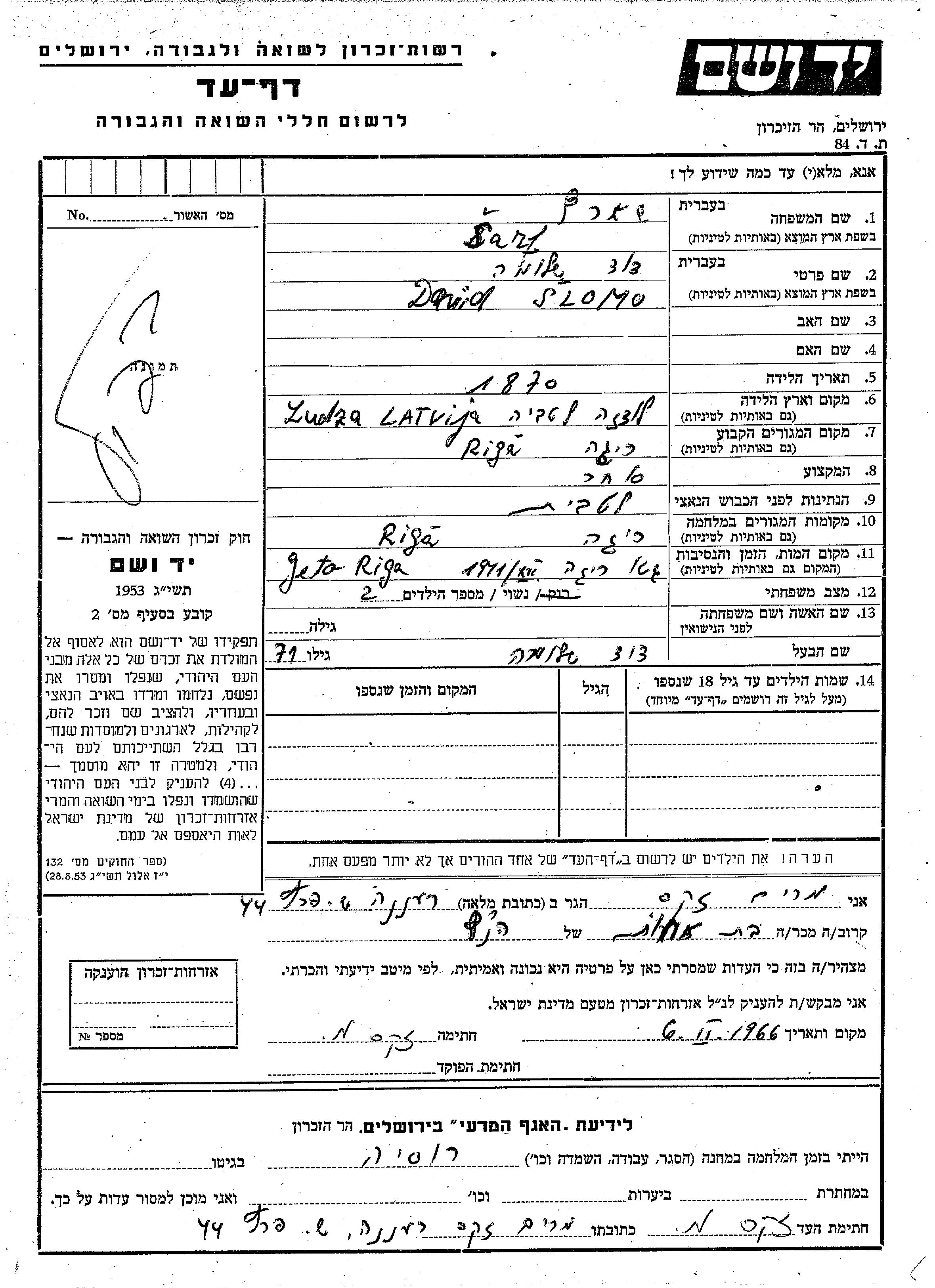 Dawid Slomo a été assassiné pendant la Shoah. Lieu de la mort: Riga, Lettonie en 12/1941.