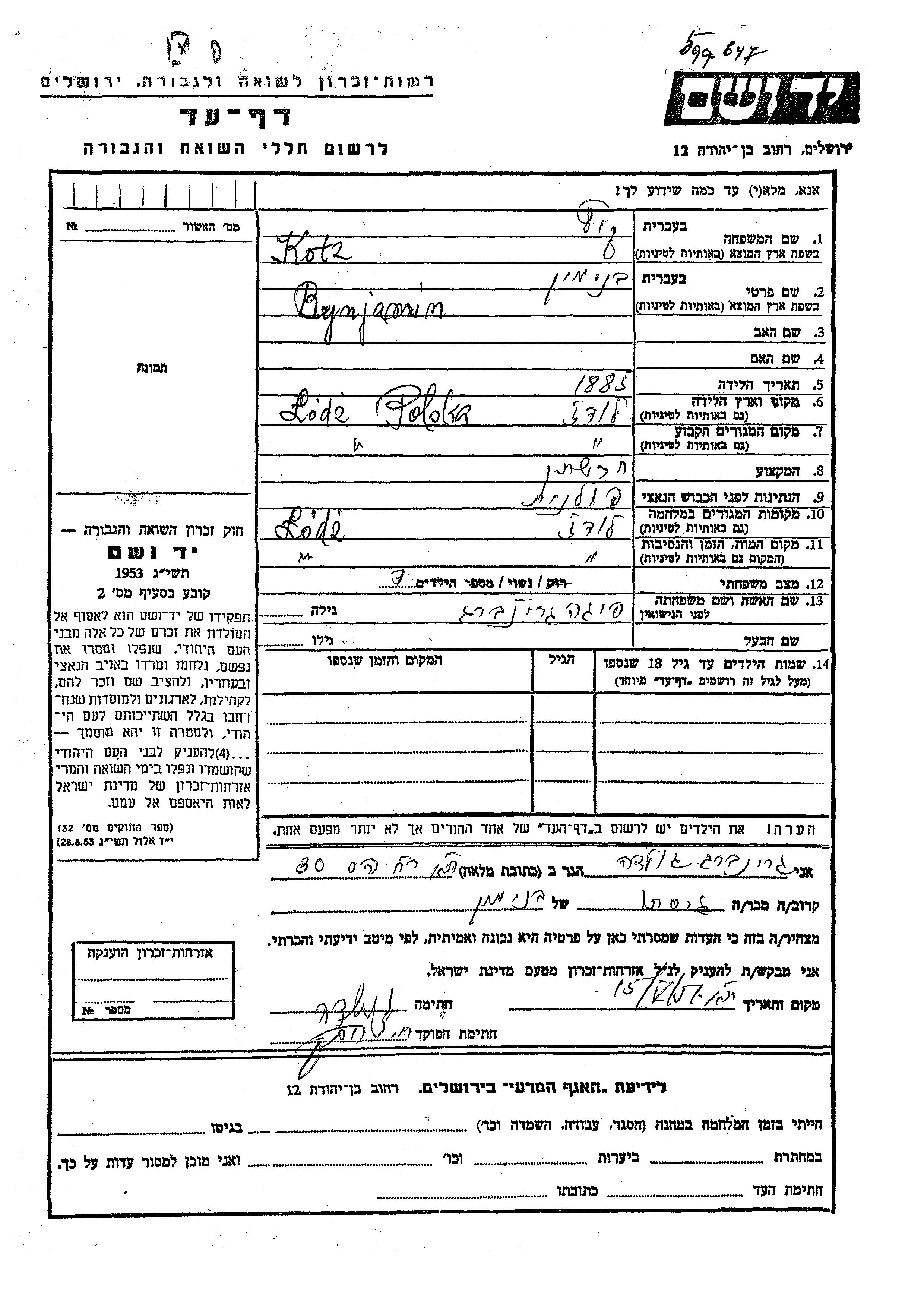 Kotz Bynjamin 1885 Lodz, Pologne Feuille de témoignage