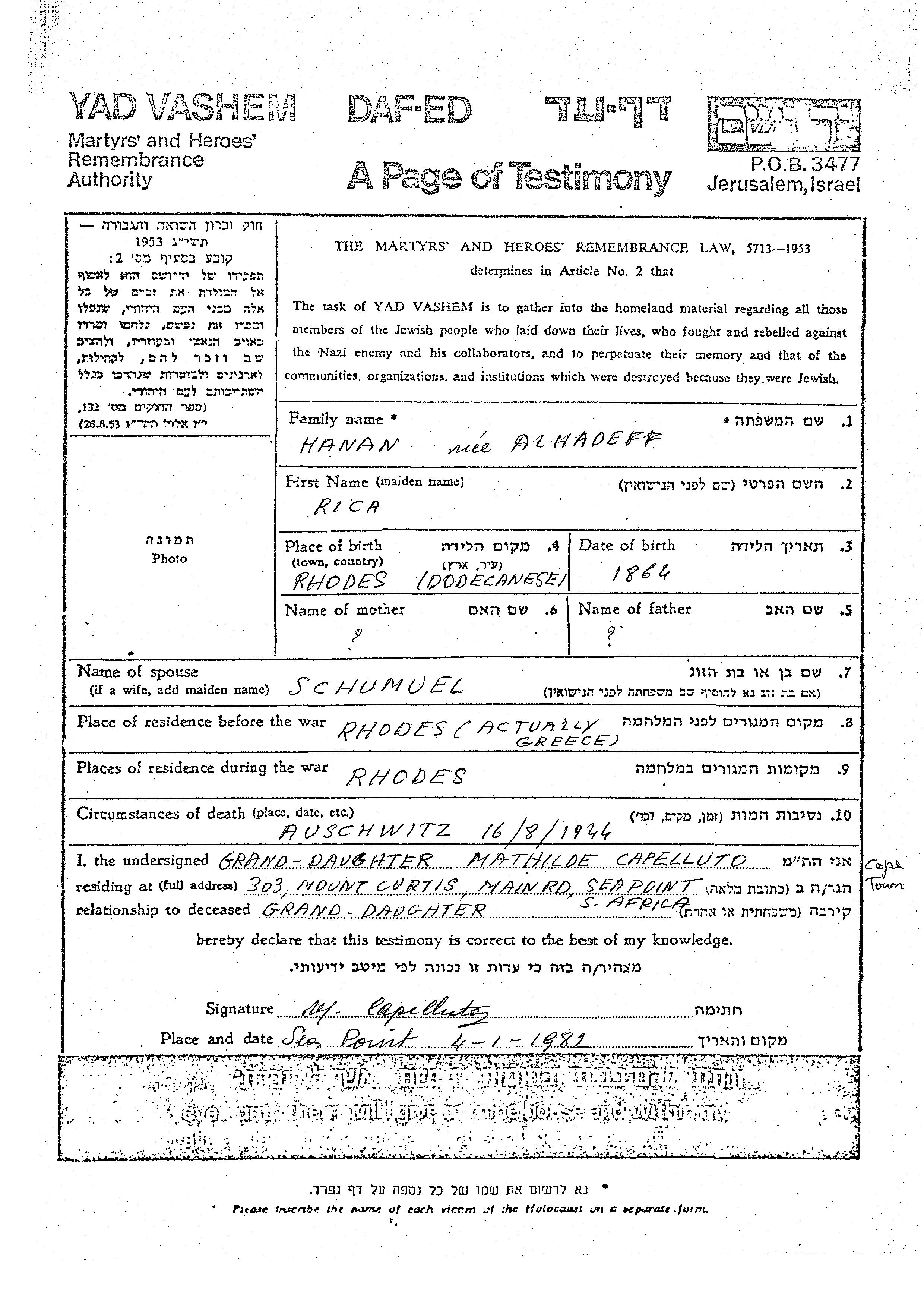 Rica Hanan née Alhadeff est née à Rhodes, Italie en 1864. Elle était Mariée à Schumuel. Avant la seconde guerre mondiale elle vivait à Rhodes, Italie. Pendant la guerre, elle était à Rhodes, Italie.
