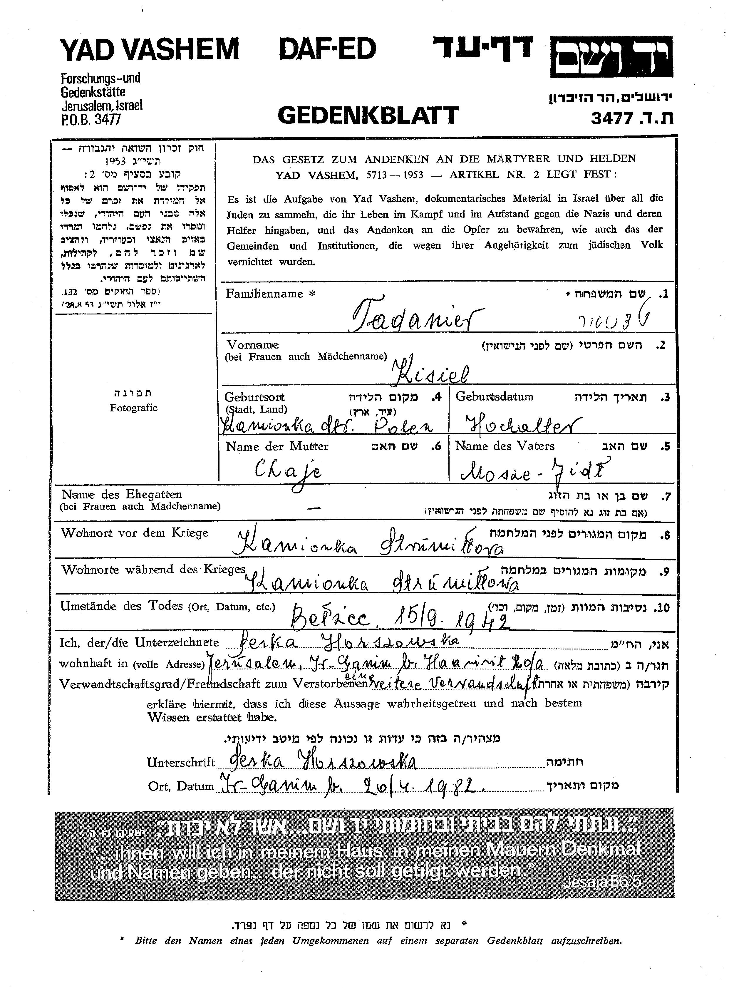 Tadanier Kisiel Kamionka, Pologne Feuille de témoignage