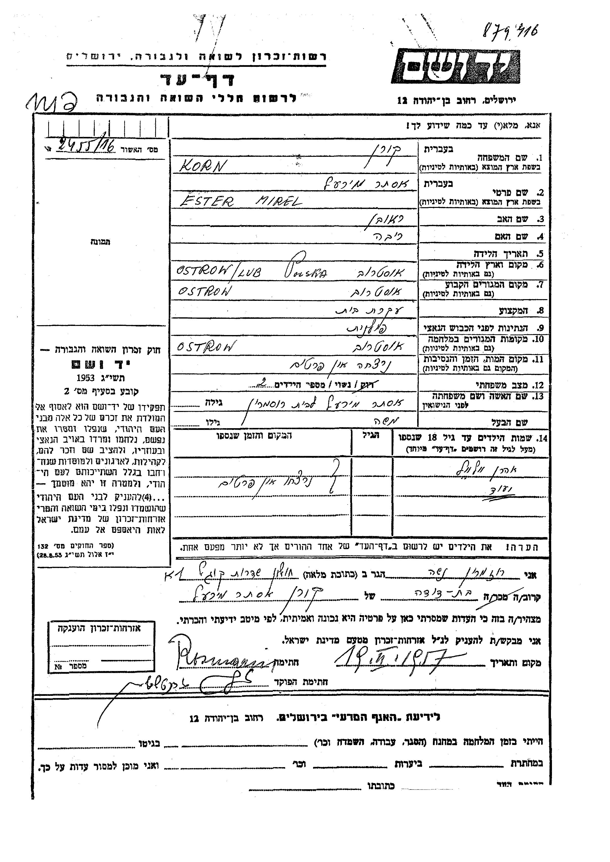 Korn Miral Ester Ostrow, Pologne Feuille de témoignage